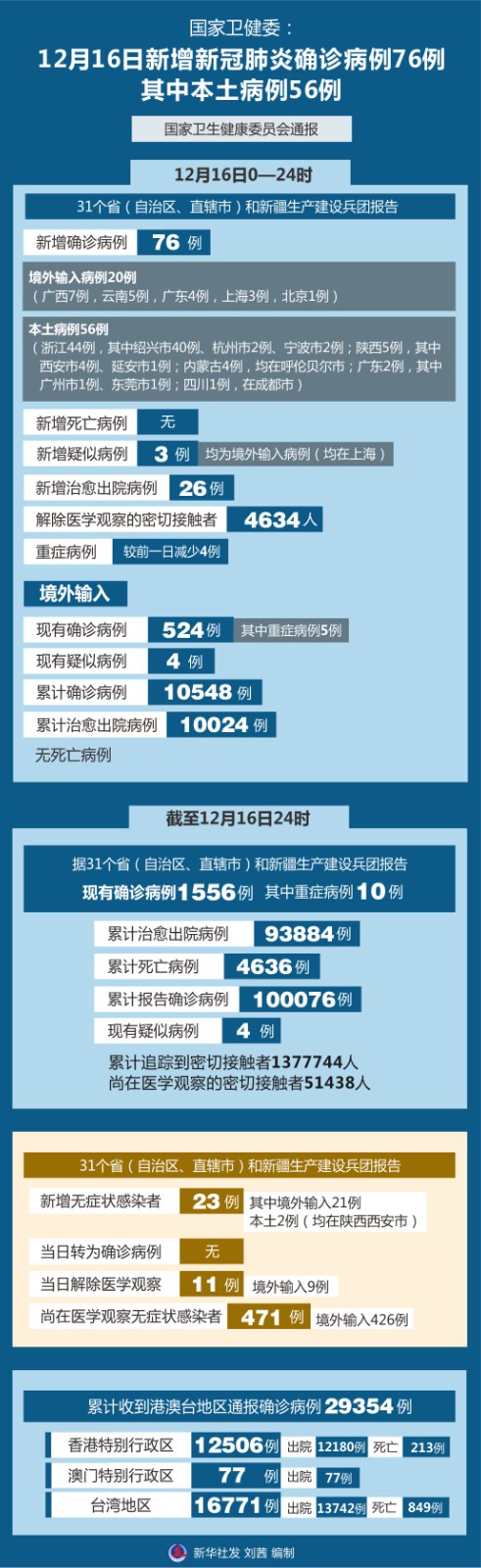 圖表:國家衛(wèi)健委:12月16日新增新冠肺炎確診病例76例 其中本土病例56例