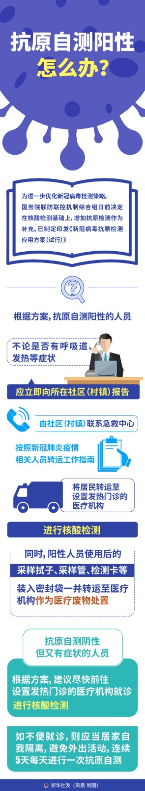 根據(jù)方案,抗原自測陽性的人員,不論是否有呼吸道、發(fā)熱等癥狀,應(yīng)立即向所在社區(qū)(村鎮(zhèn))報告,由社區(qū)(村鎮(zhèn))聯(lián)系急救中心按照新冠肺炎疫情相關(guān)人員轉(zhuǎn)運工作指南,將居民轉(zhuǎn)運至設(shè)置發(fā)熱門診的醫(yī)療機(jī)構(gòu),進(jìn)行核酸檢測。