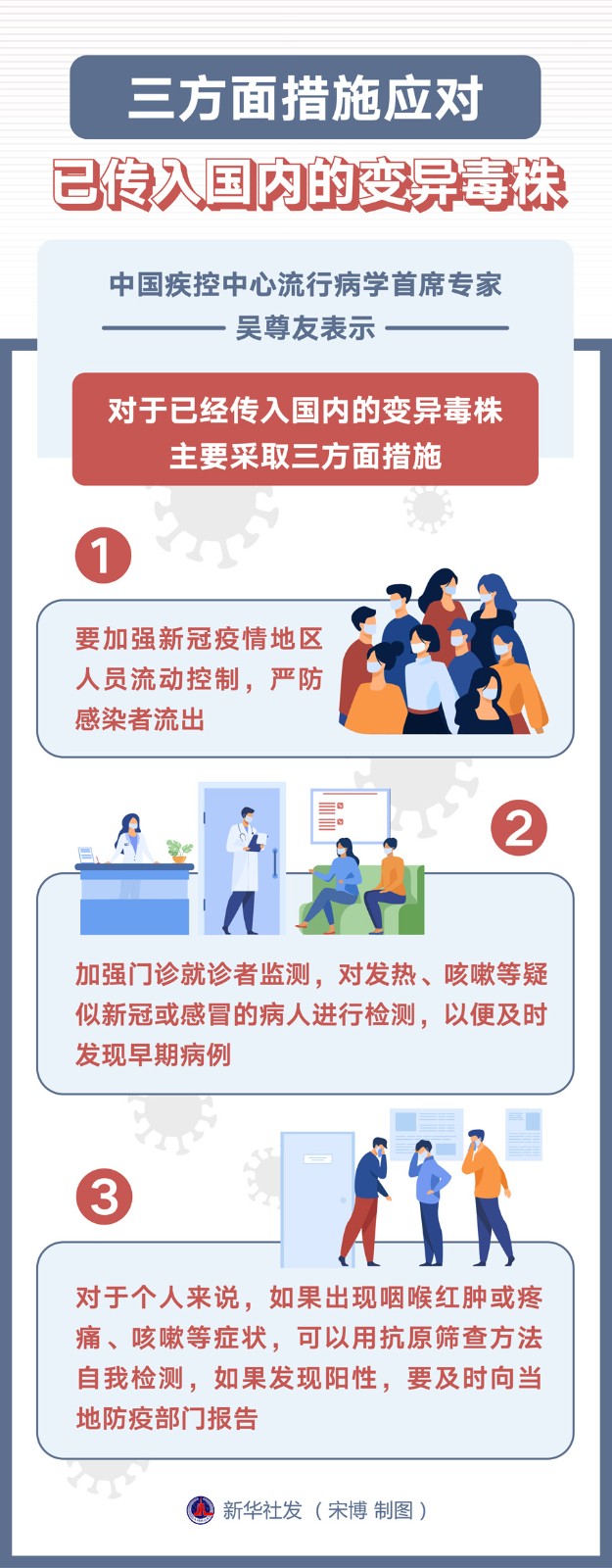 中國疾控中心流行病學首席專家吳尊友表示,對于已經傳入國內的變異毒株,主要采取三方面措施。