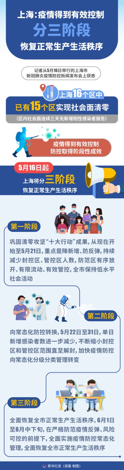 記者從5月16日舉行的上海市新冠肺炎疫情防控新聞發(fā)布會上獲悉,上海16個區(qū)中已有15個區(qū)實現(xiàn)社會面清零(區(qū)內(nèi)社會面連續(xù)三天無新增陽性感染者報告),疫情得到有效控制,防控取得階段性成效。5月16日起,上海將分三階段恢復(fù)正常生產(chǎn)生活秩序。