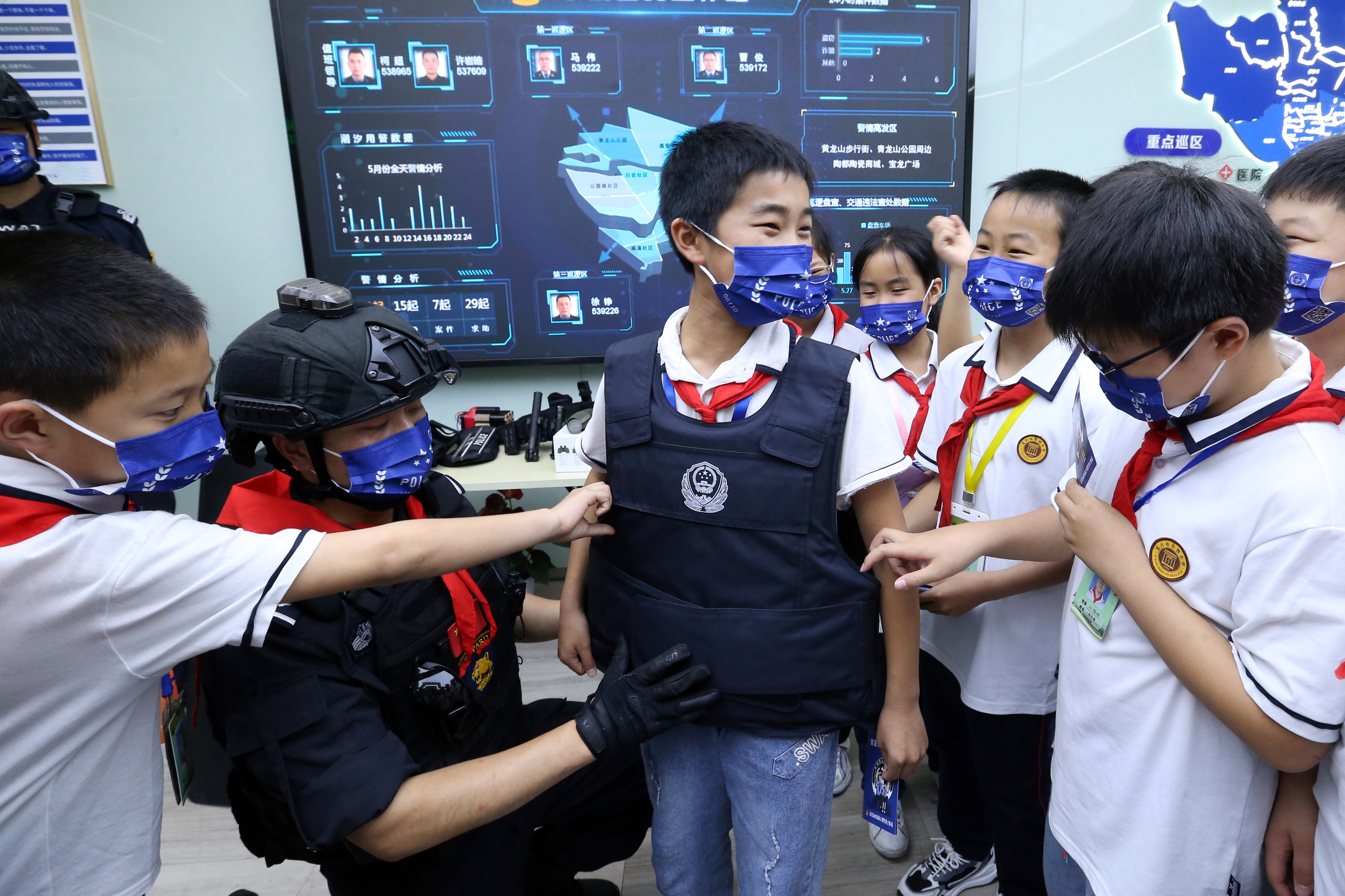 圖為5月30日,學(xué)生們在警務(wù)站體驗(yàn)警用裝備。