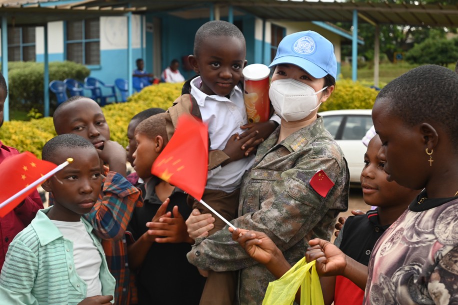 5月26日,在剛果(金)布卡武市國(guó)際SOS兒童村,中國(guó)第25批赴剛果(金)維和醫(yī)療分隊(duì)隊(duì)員開(kāi)展愛(ài)心傳遞活動(dòng)。