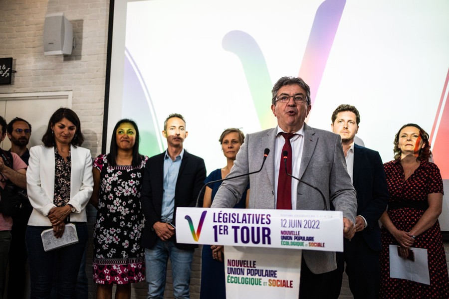 6月12日,法國極左翼政黨“不屈法國”領(lǐng)導(dǎo)人梅朗雄在巴黎參加選后集會。