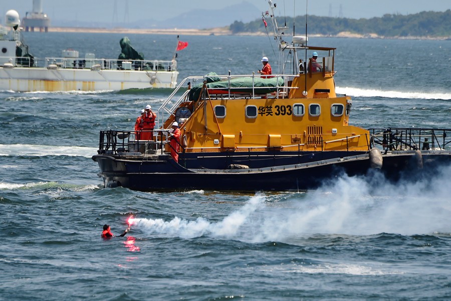 6月28日,參加演練的“華英393”救助艇準備救助“落水”船員。