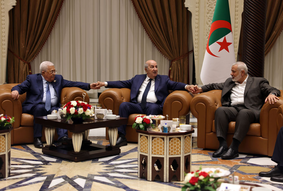 7月5日,在阿爾及利亞阿爾及爾,巴勒斯坦總統(tǒng)、巴民族解放運(yùn)動(dòng)(法塔赫)主席阿巴斯(左)與巴伊斯蘭抵抗運(yùn)動(dòng)(哈馬斯)政治局領(lǐng)導(dǎo)人伊斯梅爾·哈尼亞(右)出席由阿爾及利亞總統(tǒng)特本(中)促成的會(huì)晤。