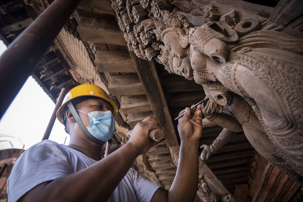 7月15日,工人在尼泊爾加德滿都進(jìn)行九層神廟建筑群修復(fù)工作。