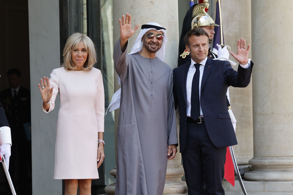 7月18日,法國(guó)總統(tǒng)馬克龍(右)和夫人布麗吉特在巴黎總統(tǒng)府愛(ài)麗舍宮迎接到訪的阿拉伯聯(lián)合酋長(zhǎng)國(guó)總統(tǒng)穆罕默德(中)。