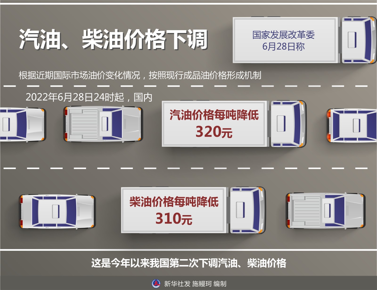 國家發(fā)展改革委6月28日稱,根據(jù)近期國際市場油價(jià)變化情況,按照現(xiàn)行成品油價(jià)格形成機(jī)制,自2022年6月28日24時(shí)起,國內(nèi)汽油、柴油價(jià)格每噸分別降低320元和310元。