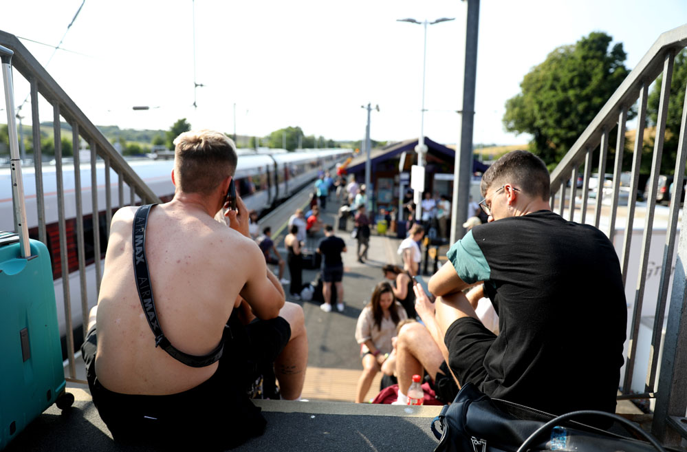7月18日,在英國(guó)阿爾恩茅斯火車(chē)站,由于天氣炎熱,前方線(xiàn)路起火,一列由愛(ài)丁堡出發(fā)至倫敦的火車(chē)被迫在此停止運(yùn)行,旅客滯留在火車(chē)站。