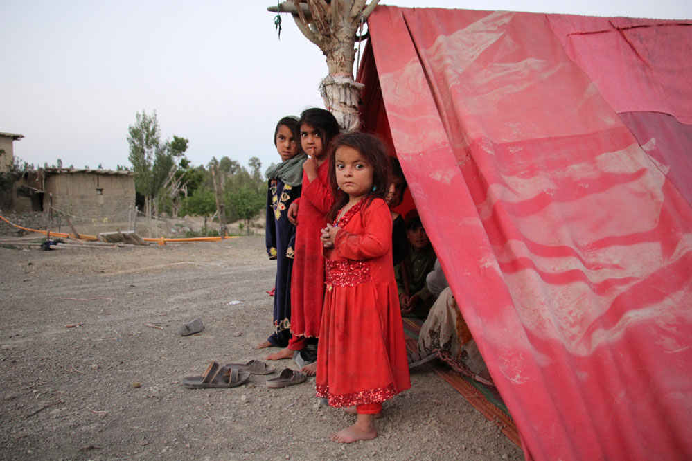 7月18日,在阿富汗帕克提卡省受災(zāi)地區(qū),兒童站在帳篷外。