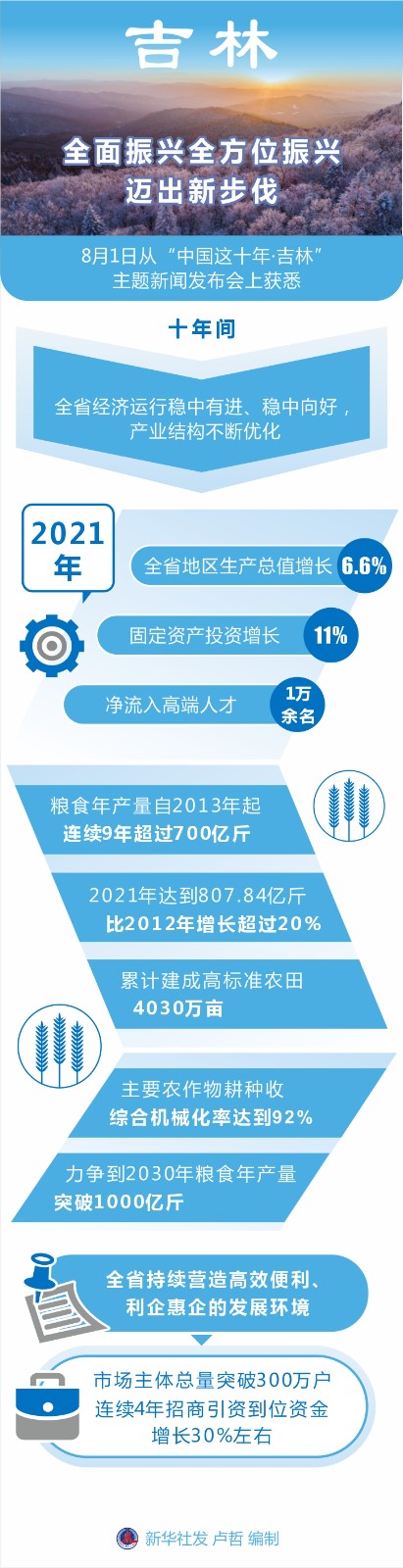 記者從8月1日舉行的“中國這十年·吉林”主題新聞發(fā)布會上了解到,10年間,吉林全省經(jīng)濟(jì)運(yùn)行穩(wěn)中有進(jìn)、穩(wěn)中向好,產(chǎn)業(yè)結(jié)構(gòu)不斷優(yōu)化,全省糧食年產(chǎn)量連續(xù)跨上700億斤、800億斤臺階,營商環(huán)境持續(xù)改善,全面振興全方位振興邁出新步伐。