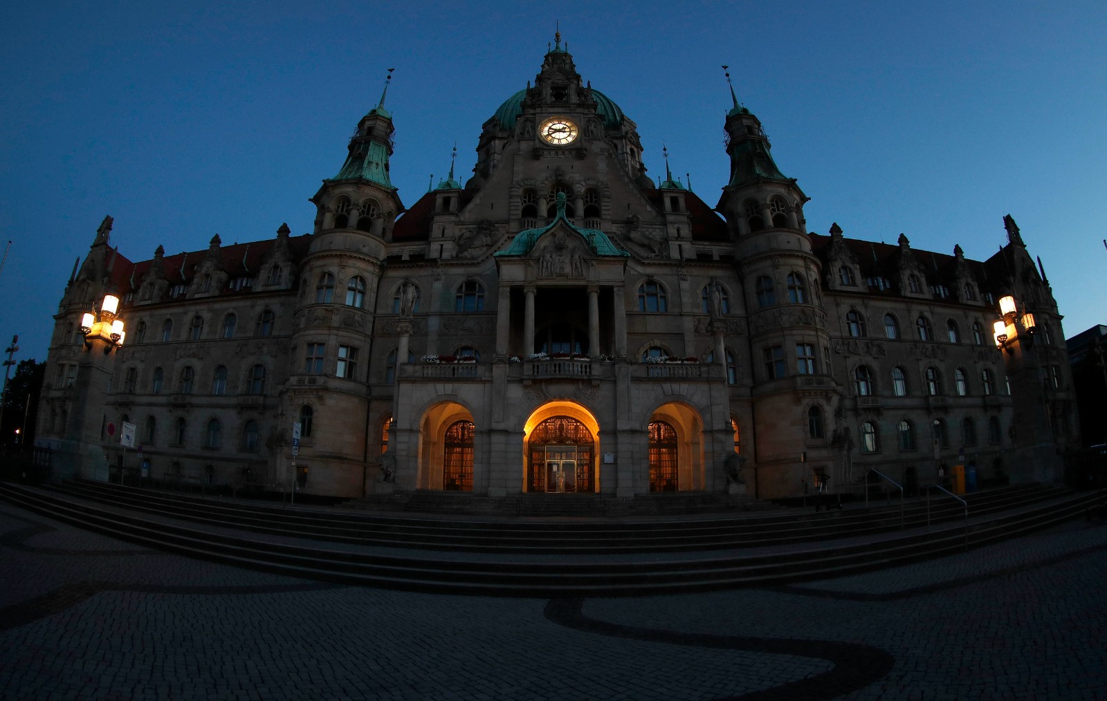 這是8月1日晚拍攝的德國(guó)漢諾威市政廳。