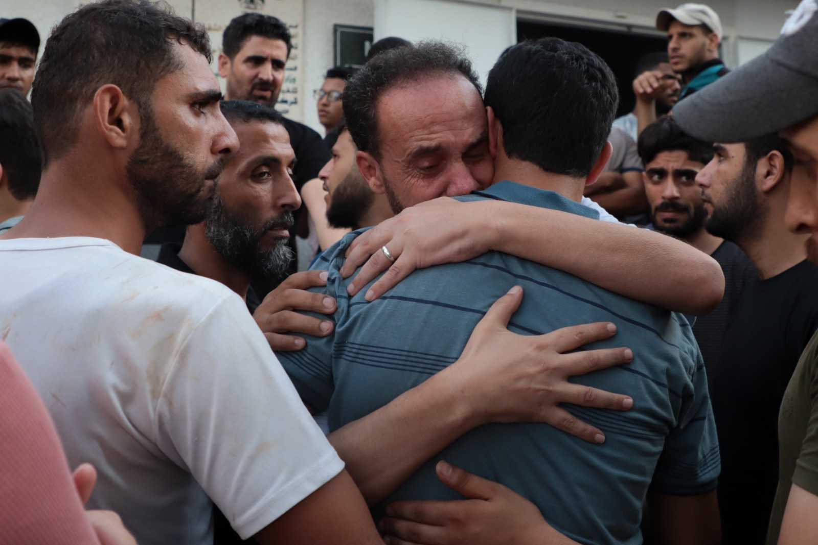 8月5日,人們?cè)诩由吵且凰t(yī)院哀悼在空襲中遇難的親人。