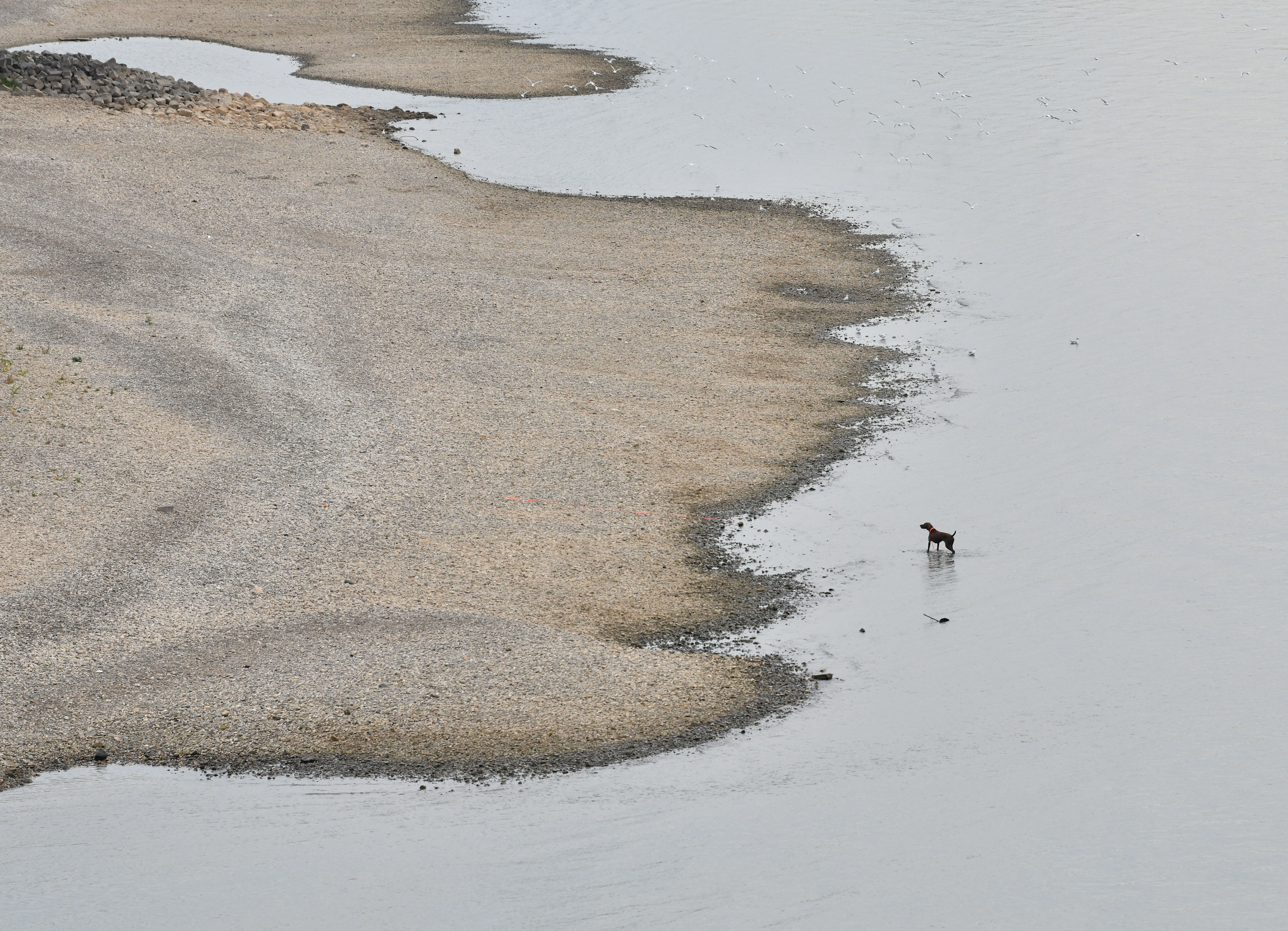 8月17日,在德國北威州杜塞爾多夫,一只小狗在萊茵河畔玩耍。