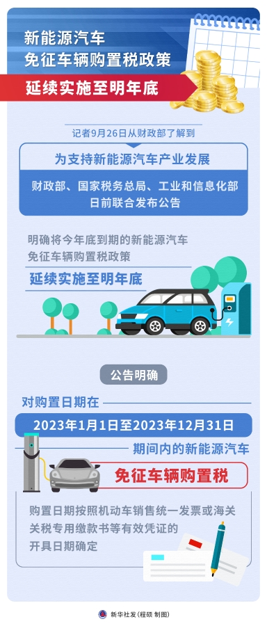 記者9月26日從財政部了解到,為支持新能源汽車產(chǎn)業(yè)發(fā)展,財政部、國家稅務(wù)總局、工業(yè)和信息化部日前聯(lián)合發(fā)布公告,明確將今年底到期的新能源汽車免征車輛購置稅政策,延續(xù)實施至明年底。