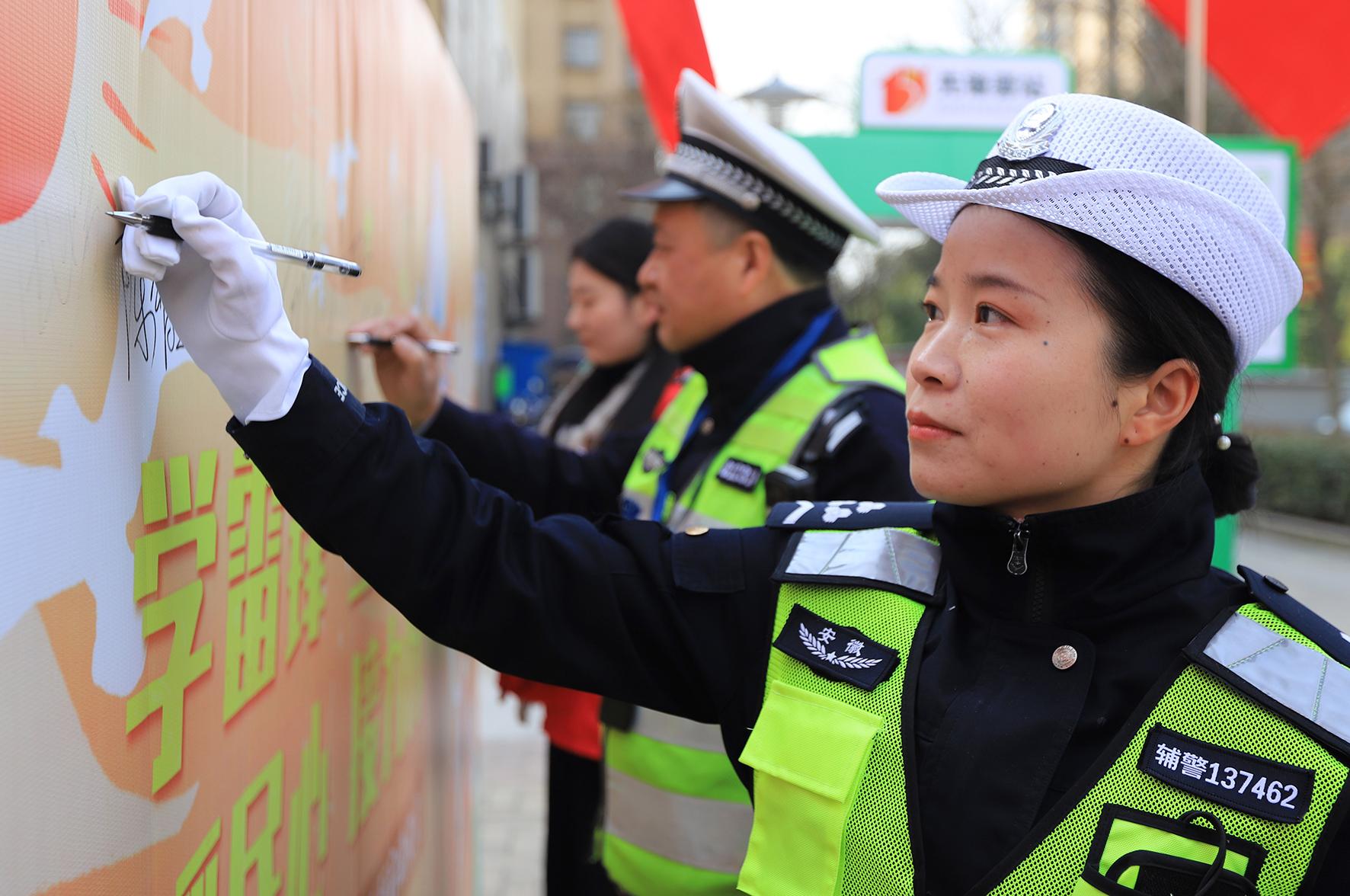 圖為民警在學(xué)雷鋒簽名墻上簽名。