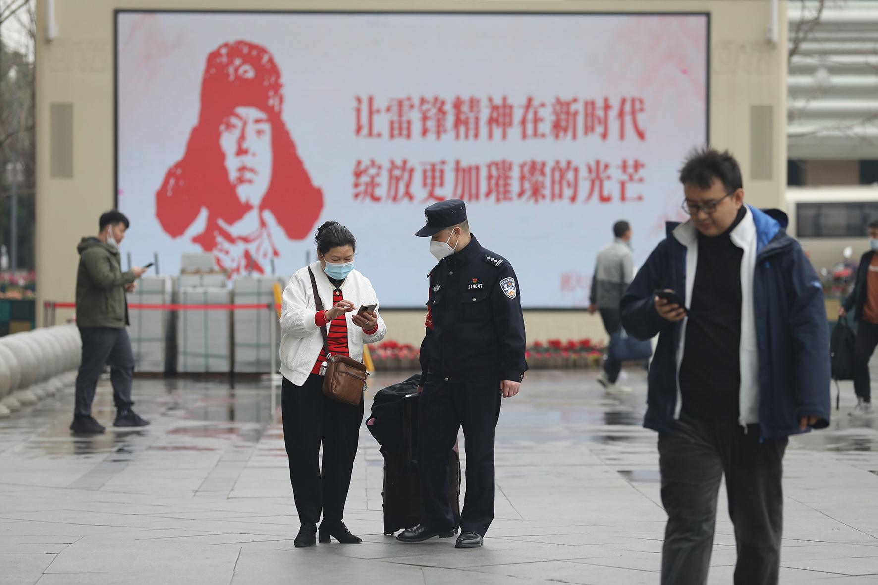 3月2日,成都鐵路公安處成都東站派出所民警為旅客提供幫助。