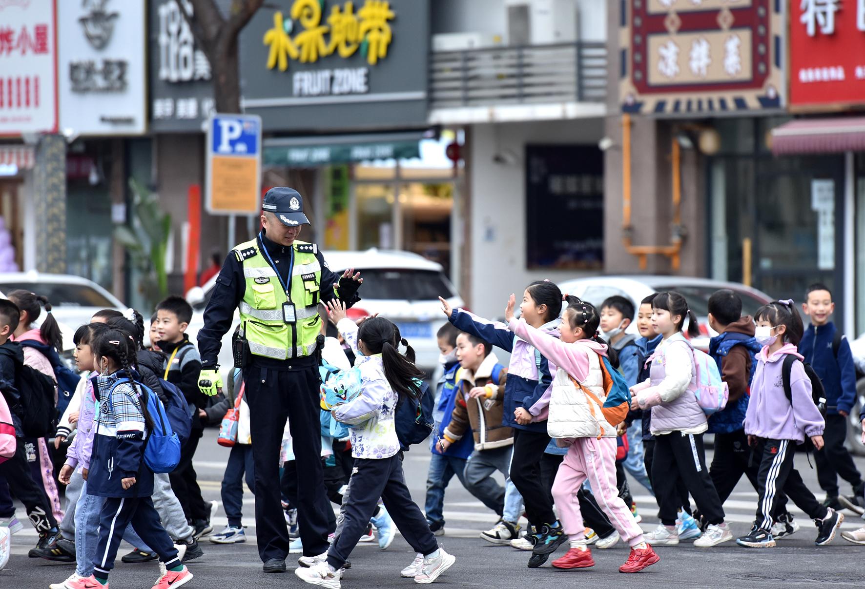 3月27日,四川省綿陽市多所小學組織學生開展春游活動,綿陽市公安局交警支隊直屬一大隊增派警力在學校周邊、復雜路段指揮護送師生步行或乘車出行,確保安全和道路暢通。