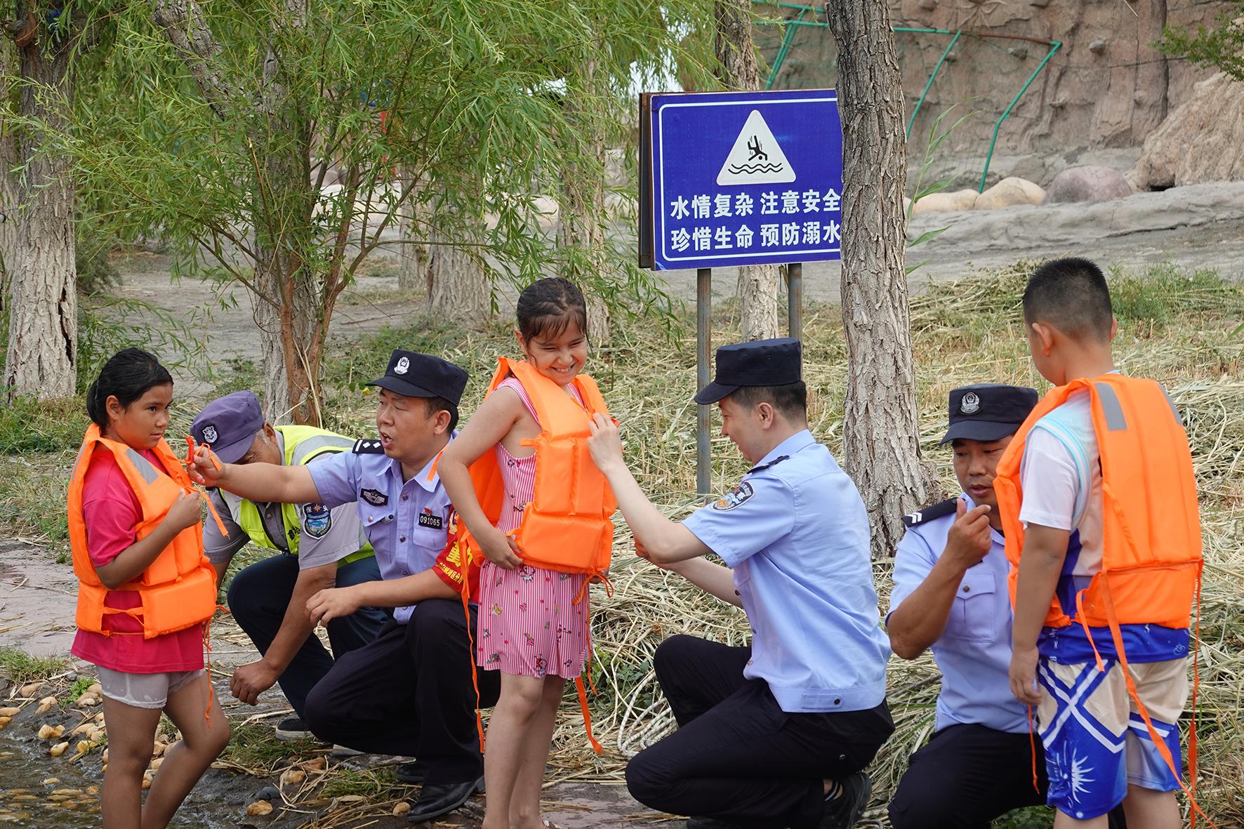 7月6日,新疆維吾爾自治區(qū)克拉瑪依市公安局白堿灘區(qū)分局白堿灘派出所民警在白沙灘旅游景區(qū)向小學生們講解如何正確使用救生衣和救生圈。