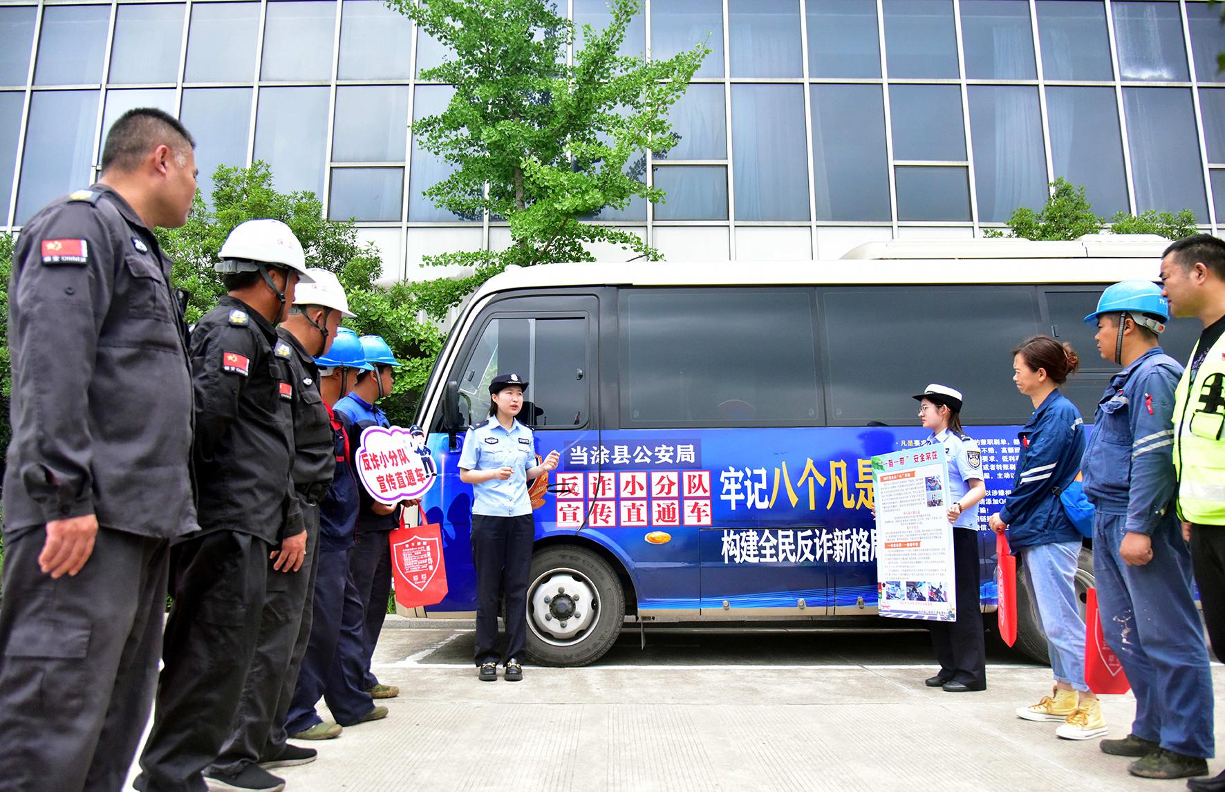 7月18日,安徽省當(dāng)涂縣公安局反詐小分隊(duì)民警向企業(yè)員工開展反詐和交通安全宣傳。