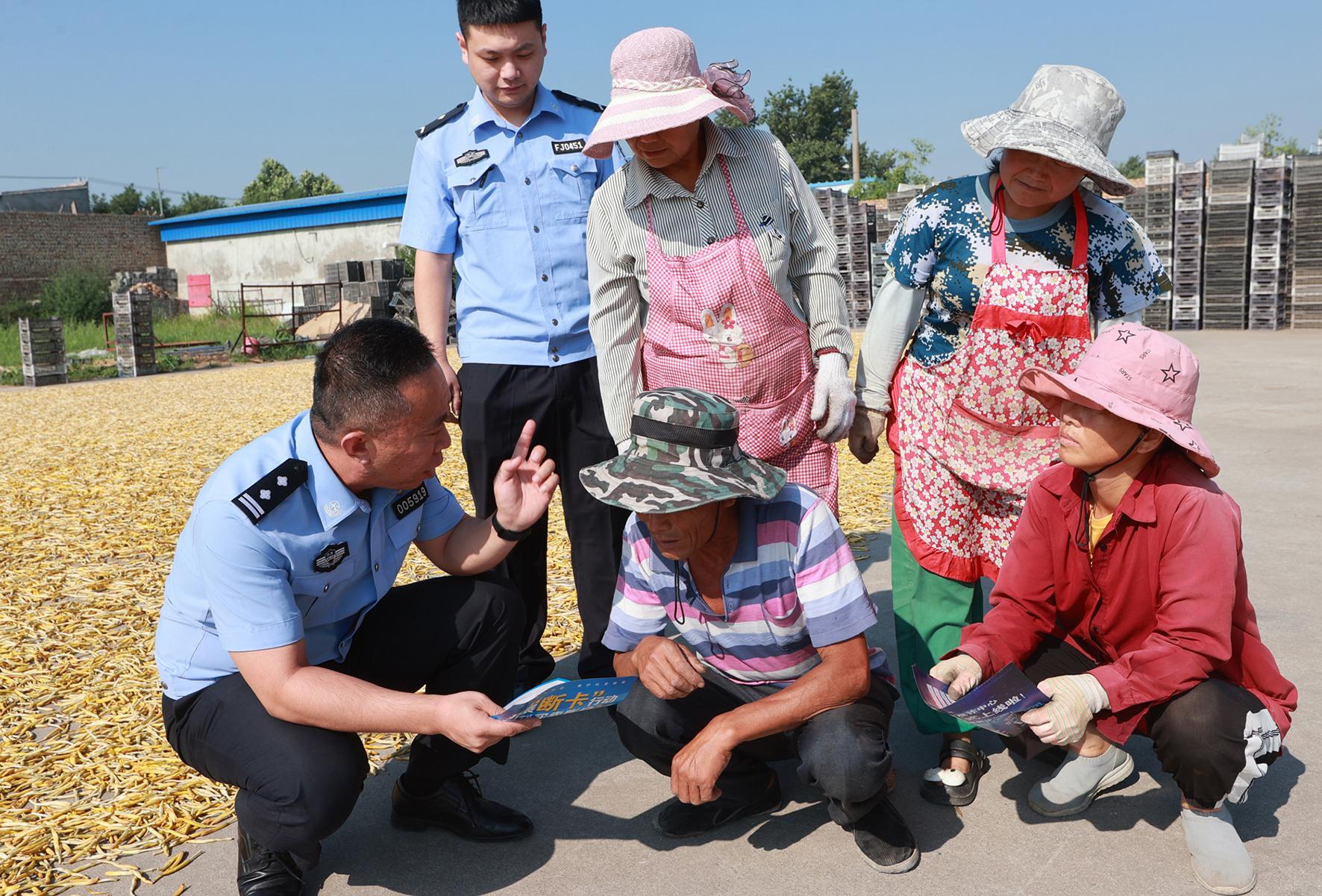 7月17日,陜西省大荔縣公安局蘇村派出所民警深入黃花菜加工產(chǎn)地,開展“面對(duì)面”反詐宣傳活動(dòng)。