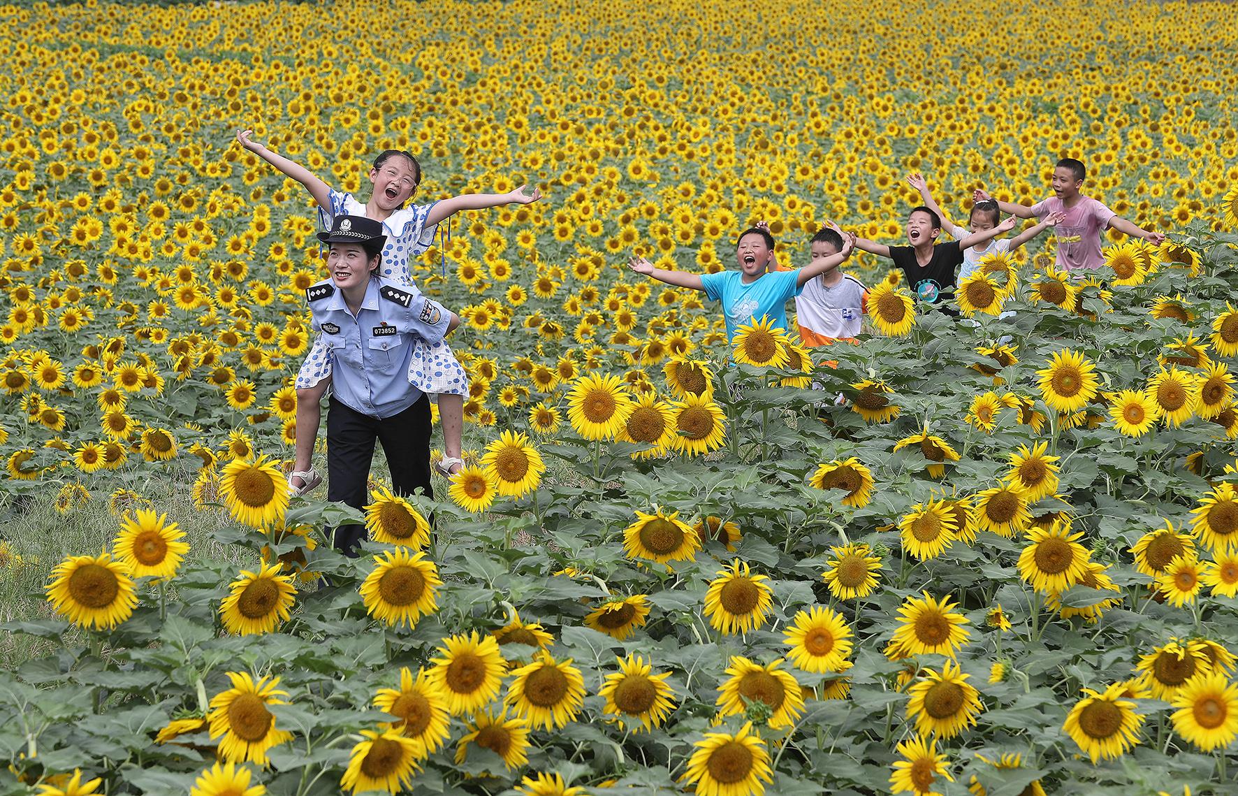 7月20日,在湖北省沙洋縣曾集鎮(zhèn)張池村向日葵花海里,沙洋縣公安局民警與村里的孩子通過“愛的護(hù)送”趣味游戲,宣傳未成年人保護(hù)法。連日來,沙洋縣公安局組織民警走進(jìn)鄉(xiāng)村和社區(qū),向孩子們開展禁毒知識、嚴(yán)防溺水、防范電詐、交通安全、未成年人保護(hù)等系列普法宣傳活動,增強(qiáng)孩子們安全防范和自我保護(hù)意識,讓孩子們度過一個(gè)安全、健康、快樂的暑假。