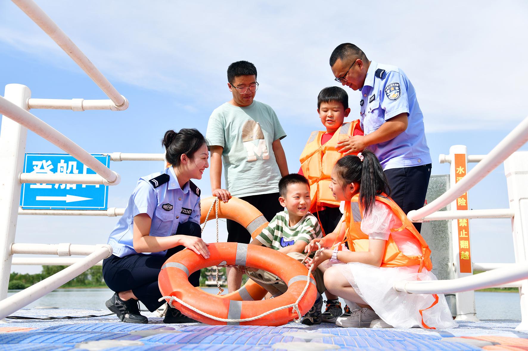 7月25日晚,長江航運(yùn)公安局南通分局民警來到長江南通開發(fā)區(qū)段江堤處,通過防溺水知識問答、救援設(shè)施演示、發(fā)放宣傳手冊等形式,促進(jìn)提高游客們的安全意識和防范能力。