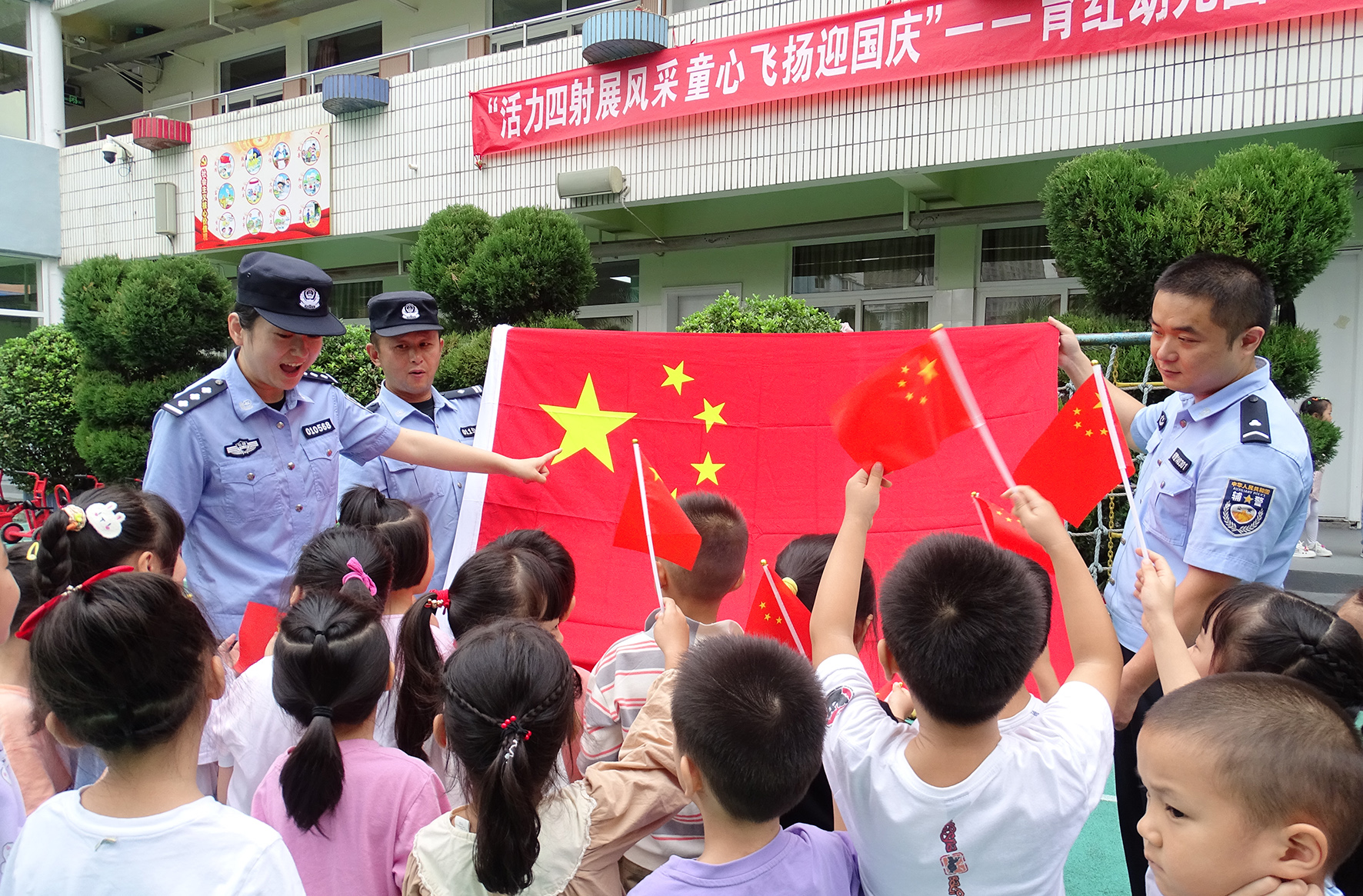 9月27日,安徽省合肥市公安局瑤海分局龍崗派出所民警輔警走進轄區(qū)幼兒園開展“我為祖國送祝?!敝黝}教育活動。