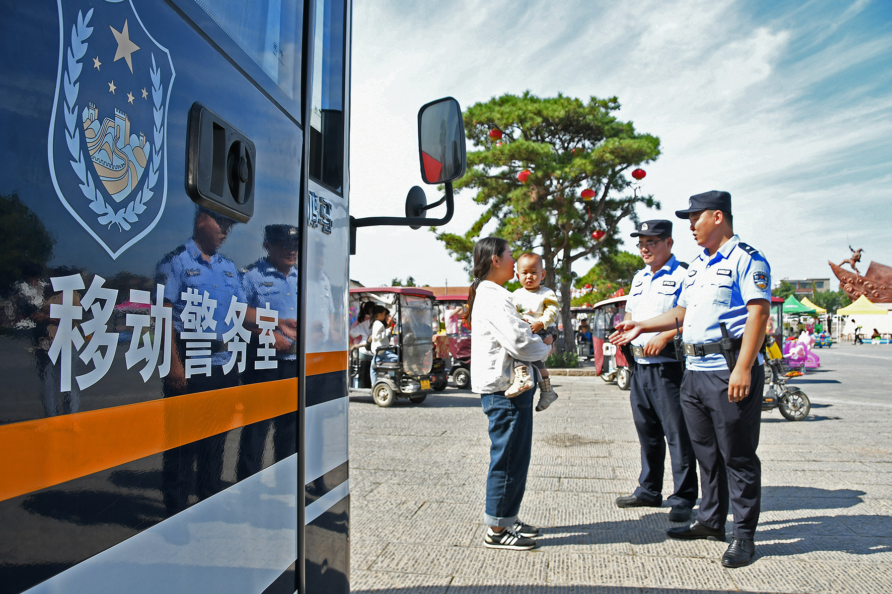 10月1日,河南省??h公安局民警輔警在古城景區(qū)為游客提供熱情服務(wù)。