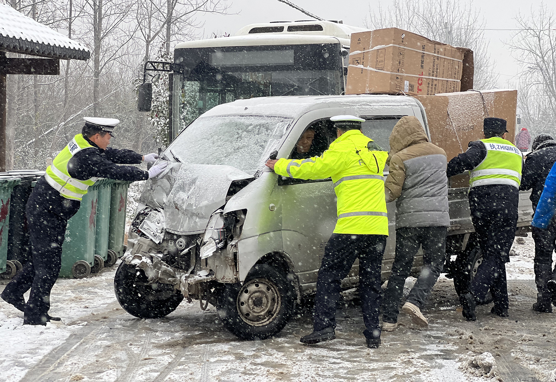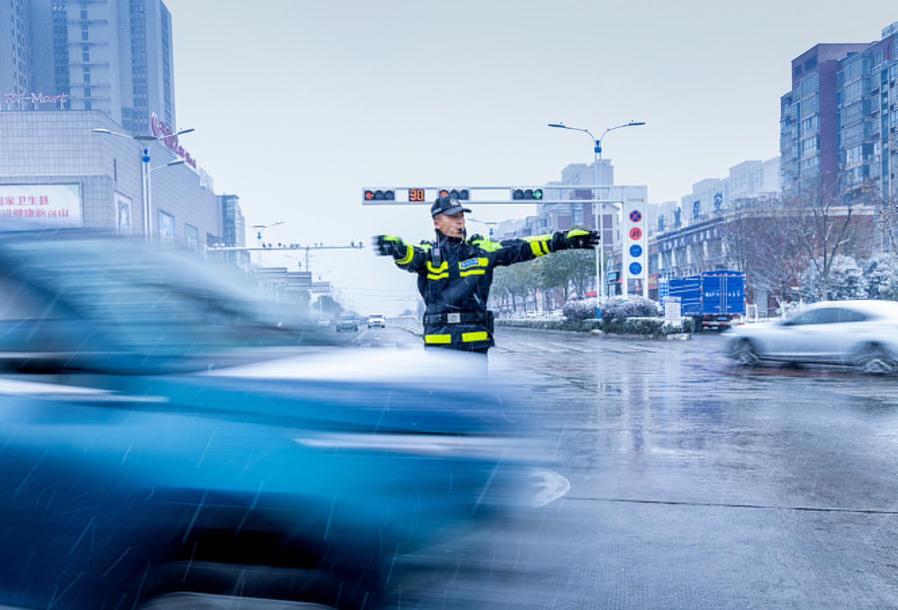 12月18日,安徽省含山縣境內(nèi)普降大雪。含山縣公安局全警動(dòng)員強(qiáng)化惡劣天氣下的道路管控、巡查、疏導(dǎo)等措施,確保道路安全暢通和群眾出行安全。