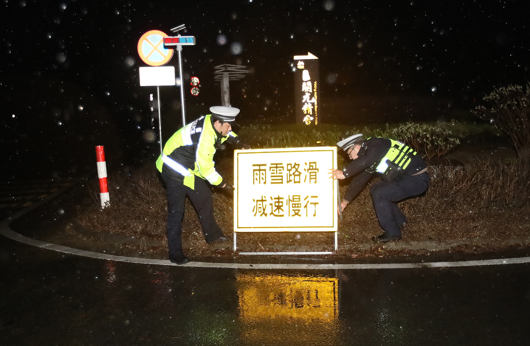 12月15日晚,江蘇省宜興市公安局交警大隊(duì)陽羨生態(tài)旅游度假區(qū)中隊(duì)民輔警在宜南山區(qū)易積雪、易發(fā)生事故路段設(shè)置警示標(biāo)牌,提醒過往車輛減速慢行。