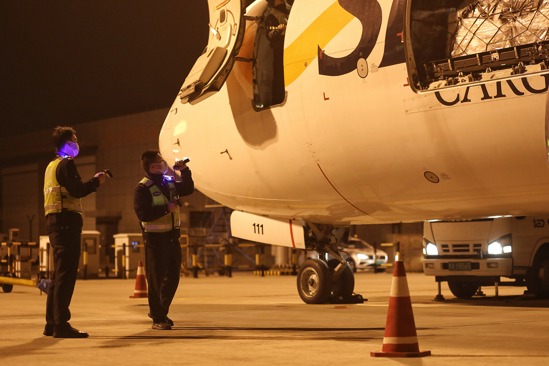 1月1日,山東出入境邊防檢查總站青島機(jī)場邊檢站民警對新年的首架國際貨運(yùn)航班進(jìn)行清艙檢查。