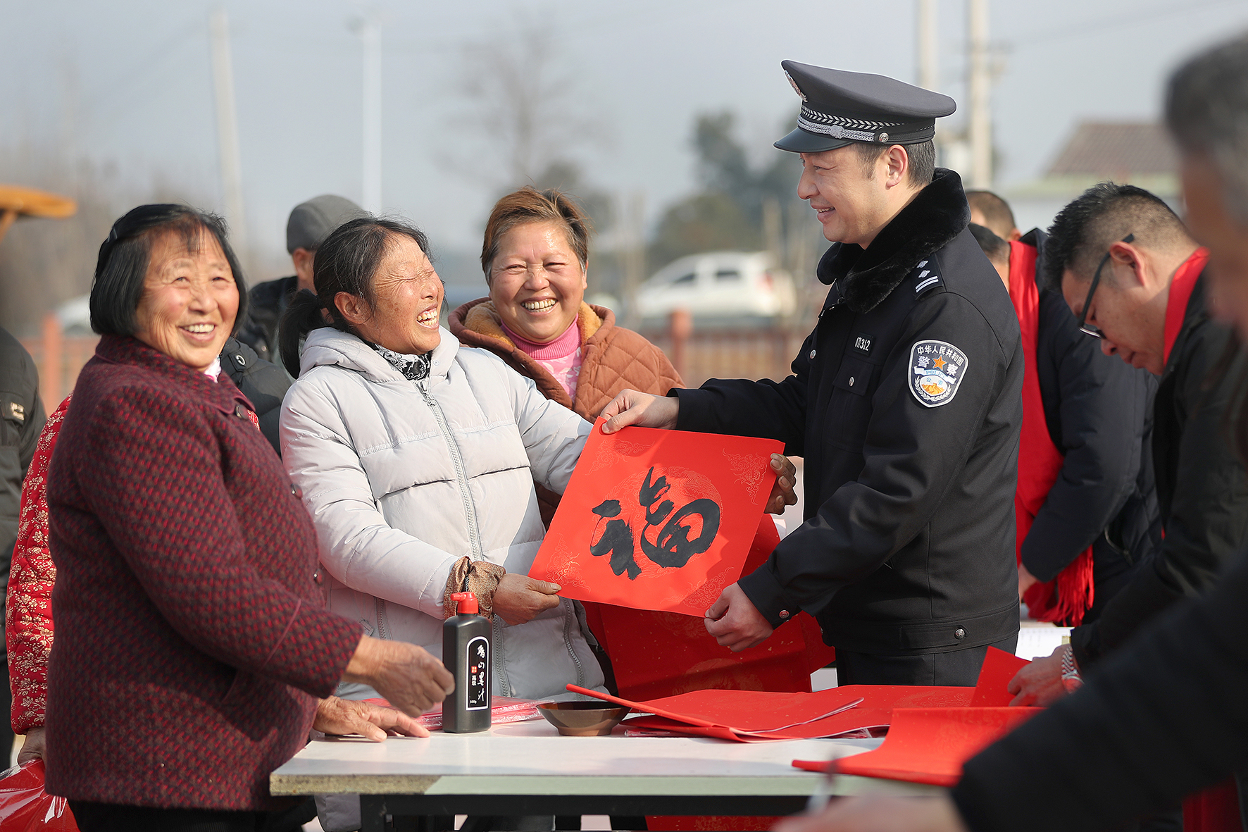 1月12日,在湖北省掇刀區(qū)團林鋪鎮(zhèn)合星村,荊門市公安局高新區(qū)·掇刀區(qū)分局團林派出所民警向村里老人送上“平安?!?。