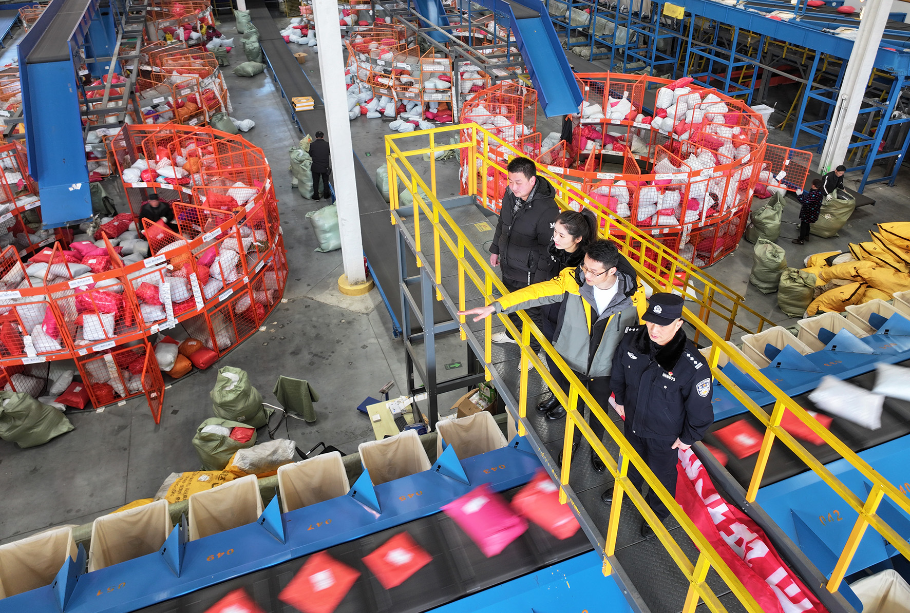 1月23日,在江蘇省南通市海門區(qū)三星鎮(zhèn)深國際·疊石橋現(xiàn)代國際物流園區(qū),海門區(qū)公安局“企無憂”服務(wù)隊民警走進分揀中心,了解安全生產(chǎn)情況,宣傳寄遞業(yè)相關(guān)法律。