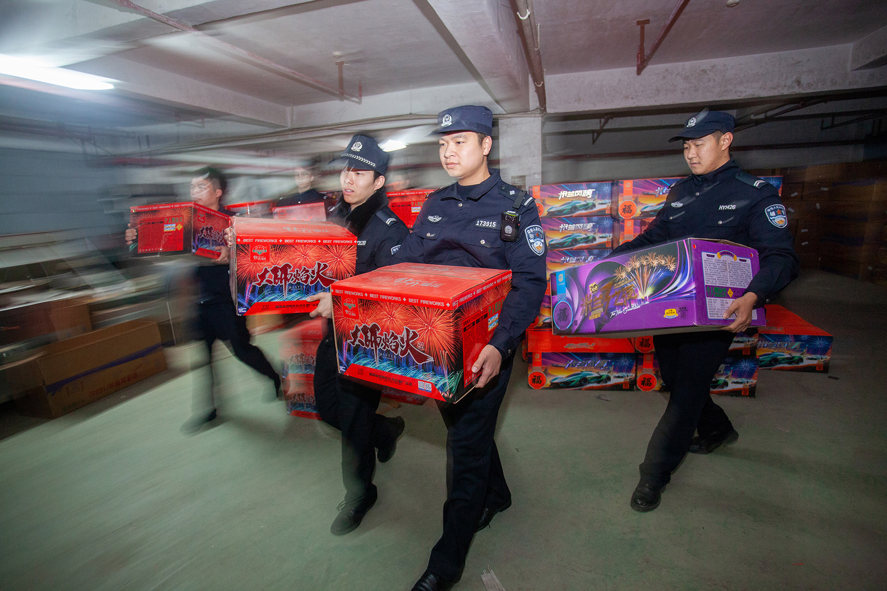 圖為2月2日,民警們對查獲的一個非法儲存煙花爆竹倉庫進(jìn)行清點和轉(zhuǎn)移。