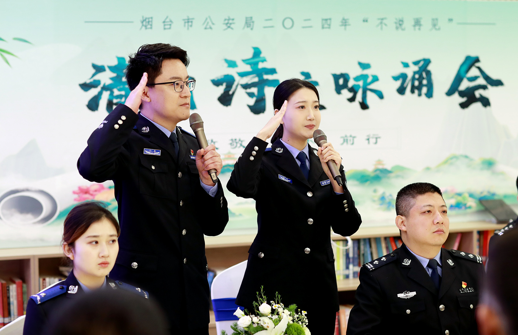 為緬懷英烈功績,凝聚奮進(jìn)力量,4月3日,山東省煙臺(tái)市公安局舉辦清明詩歌詠誦會(huì),15名民警輔警現(xiàn)場深情詠誦了9首原創(chuàng)作品,追憶煙臺(tái)公安英烈的英勇事跡和感人的故事。