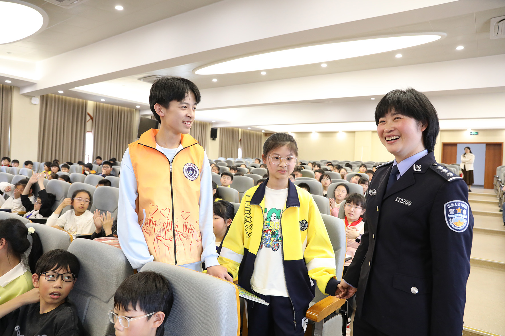 圖為民警、少年宣講團(tuán)成員和學(xué)生一起互動(dòng)。