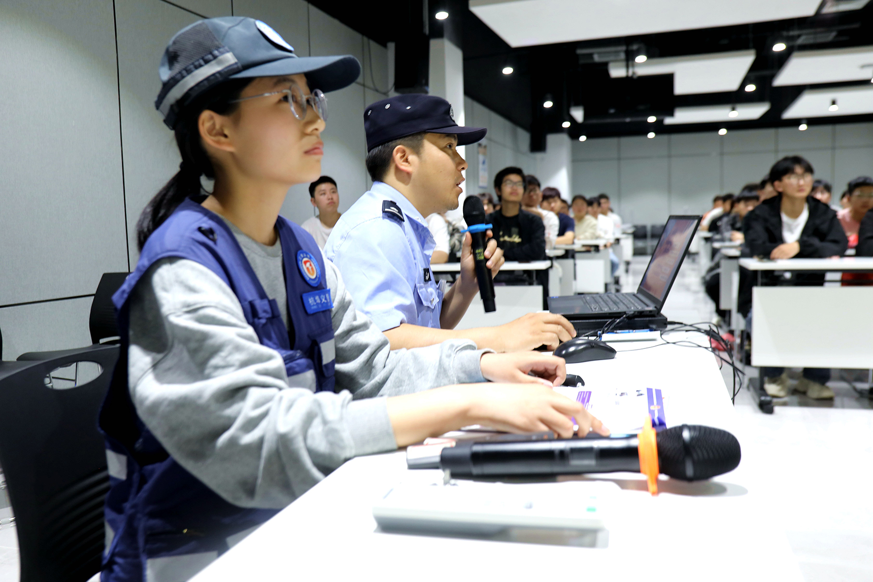 圖三:片區(qū)輔警帶領(lǐng)網(wǎng)格員在企業(yè)新招收員工培訓(xùn)會(huì)上進(jìn)行安全防范宣傳。