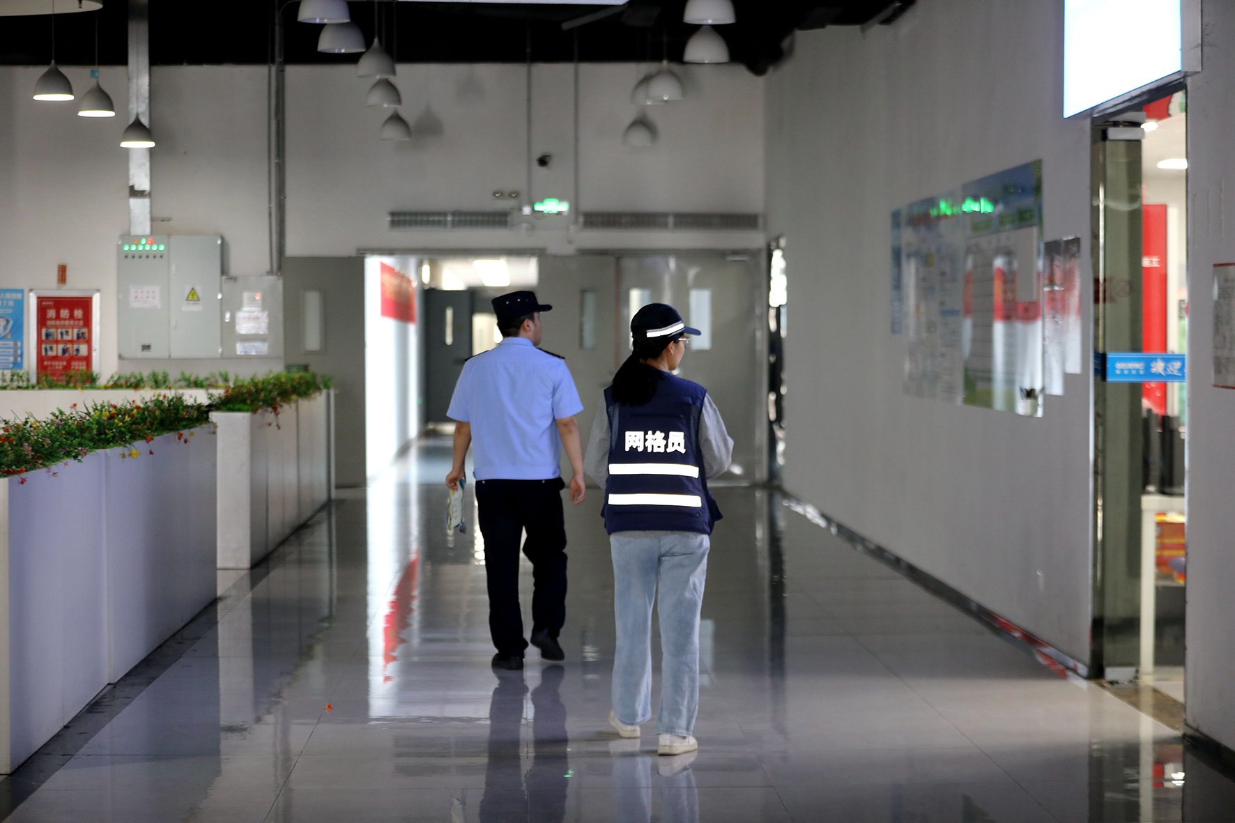 圖二:片區(qū)輔警與網(wǎng)格員在企業(yè)里檢查安全隱患。