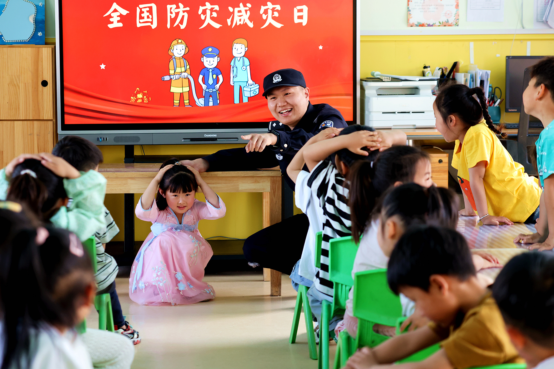5月9日,安徽省合肥市公安局瑤海分局龍崗派出所民警走進轄區(qū)學校開展防震減災應急疏散演練活動。