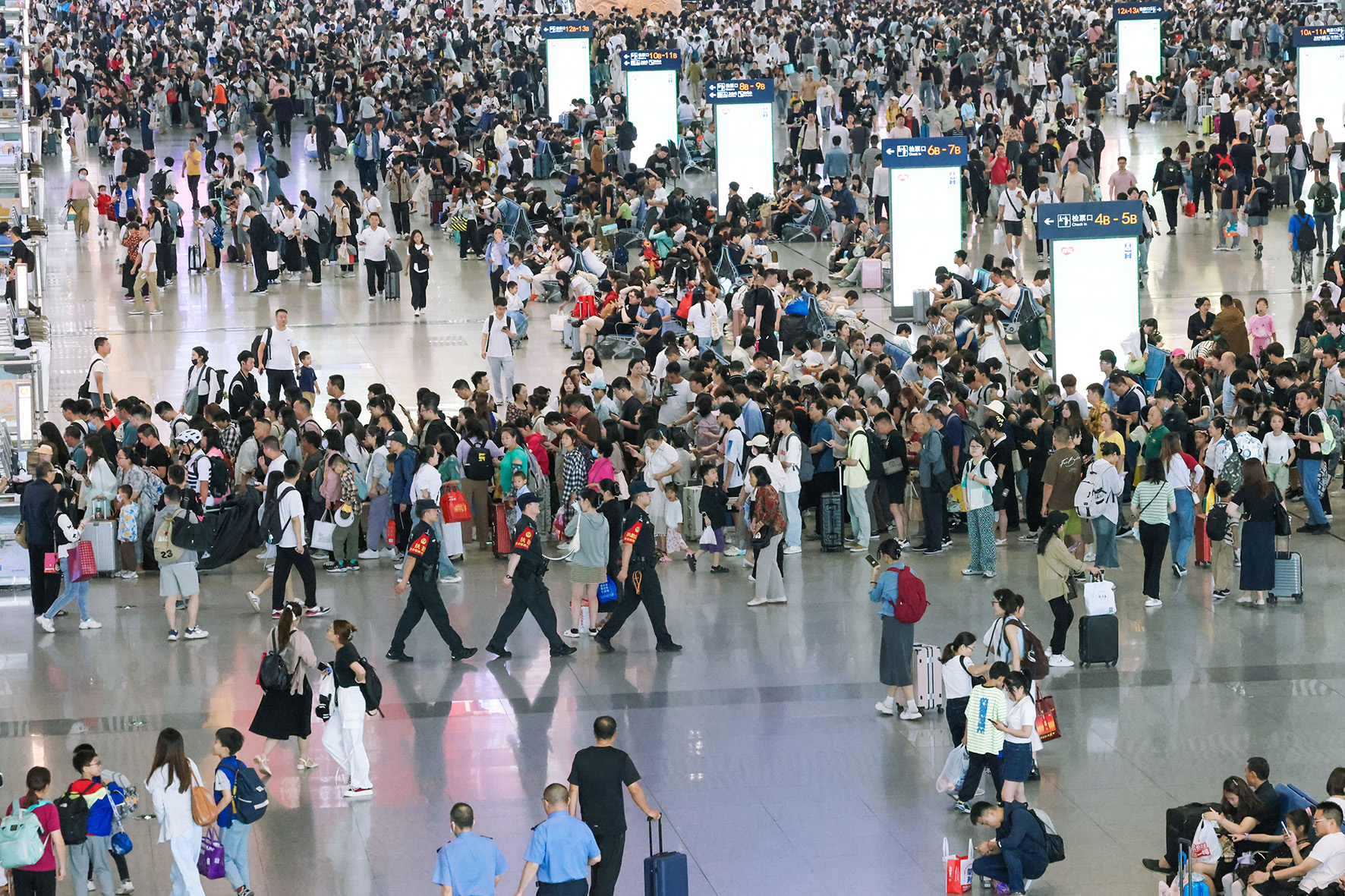 6月8日,在西安北站候車室,西安鐵路公安處特警支隊民警在候車室里執(zhí)勤巡邏。