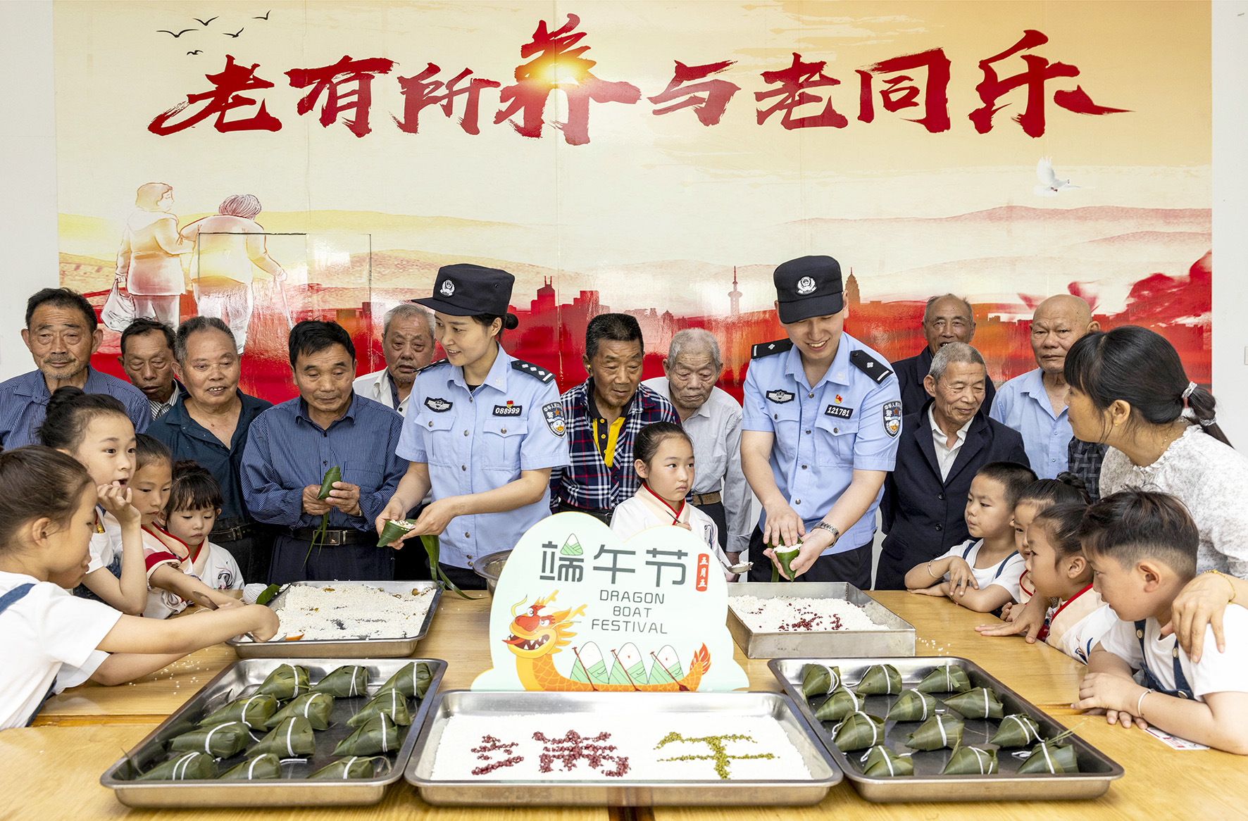 6月9日,安徽省舒城縣公安局交管大隊聯(lián)合五顯派出所走進轄區(qū)敬老院,與老人們一起包粽子,宣講出行、用電等方面安全知識。