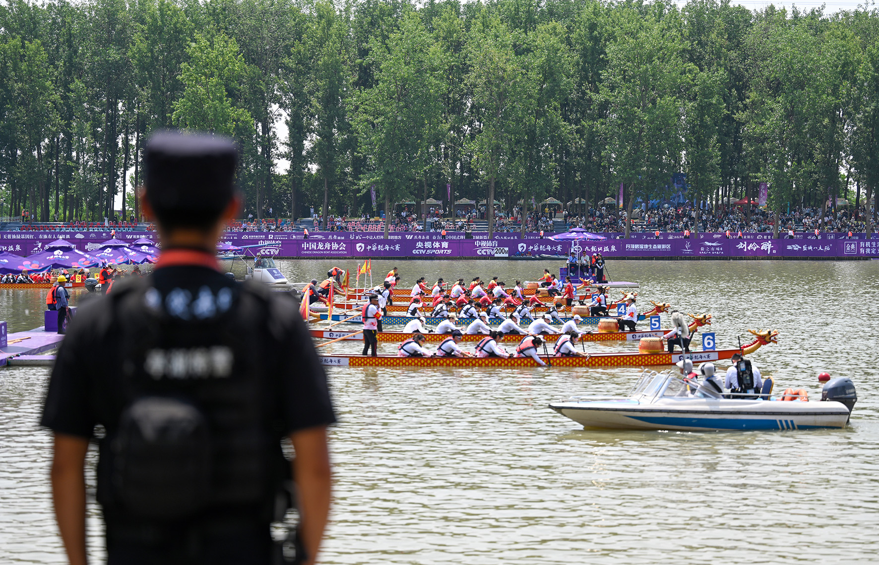 6月9日,江蘇省鹽城市公安局亭湖分局巡特警在2024年中華龍舟大賽現(xiàn)場執(zhí)勤。