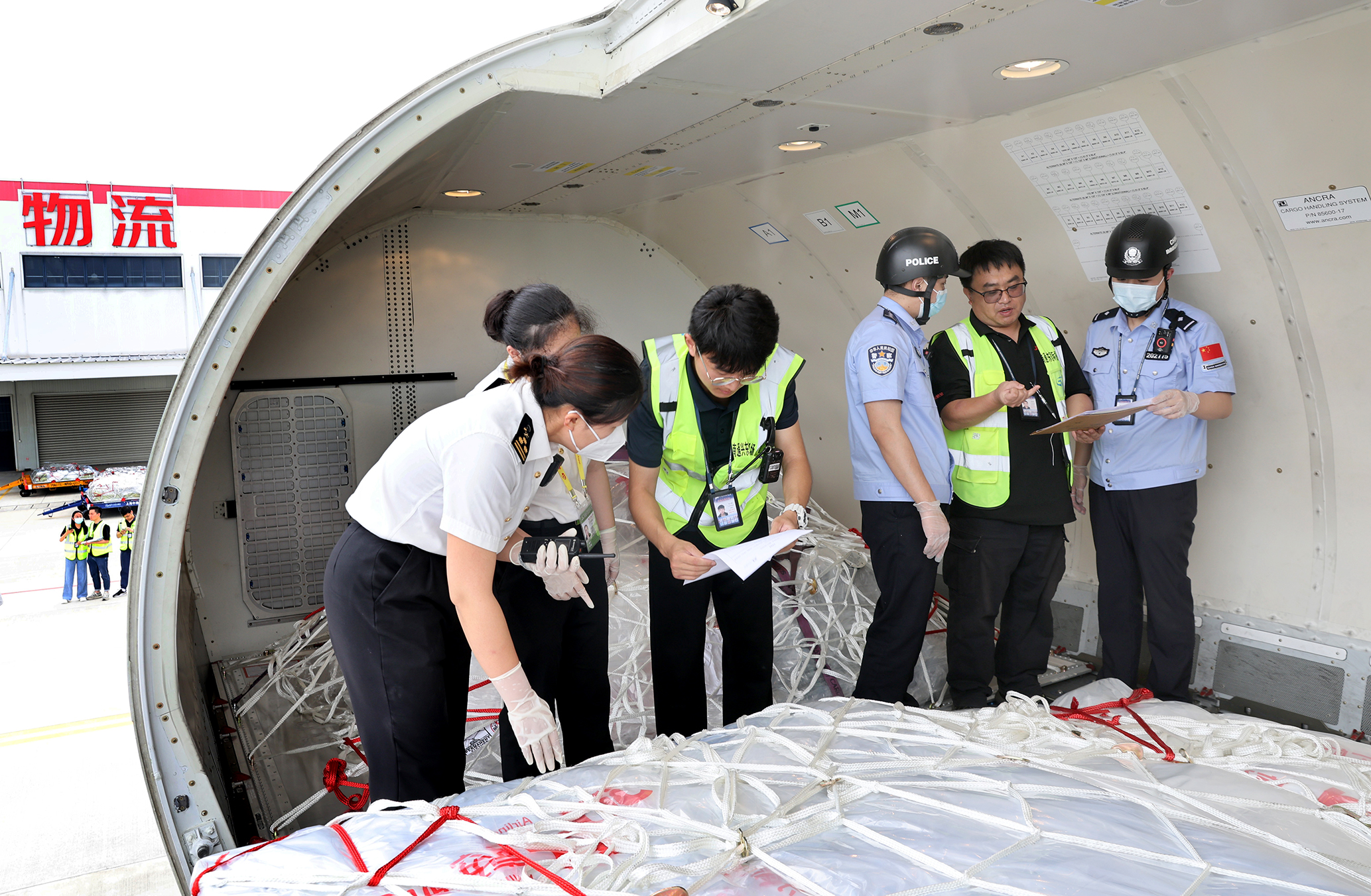 6月27日,南通海關(guān)關(guān)員(左)在貨艙中對(duì)出口貨物開展實(shí)地監(jiān)管,南通邊檢民警進(jìn)行清艙檢查。當(dāng)日,由中國外運(yùn)運(yùn)營、京東航空?qǐng)?zhí)飛的南通至仁川國際貨運(yùn)航線在南通機(jī)場(chǎng)成功首航。