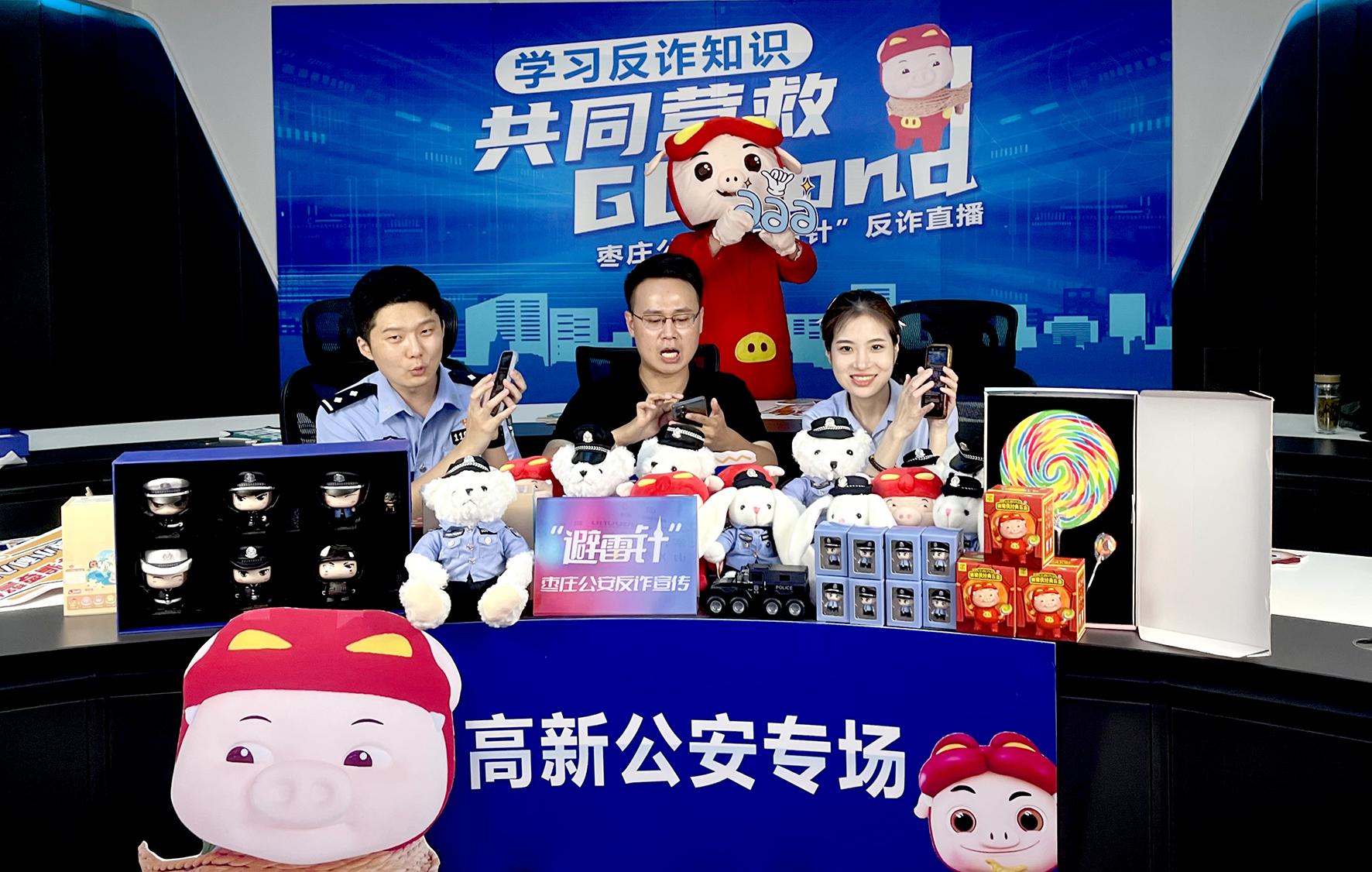 7月28日,在山東省棗莊市公安局高新分局“避雷針”反詐專(zhuān)場(chǎng)直播間,民警和反詐志愿者通過(guò)網(wǎng)絡(luò)直播宣傳反電詐知識(shí)。
