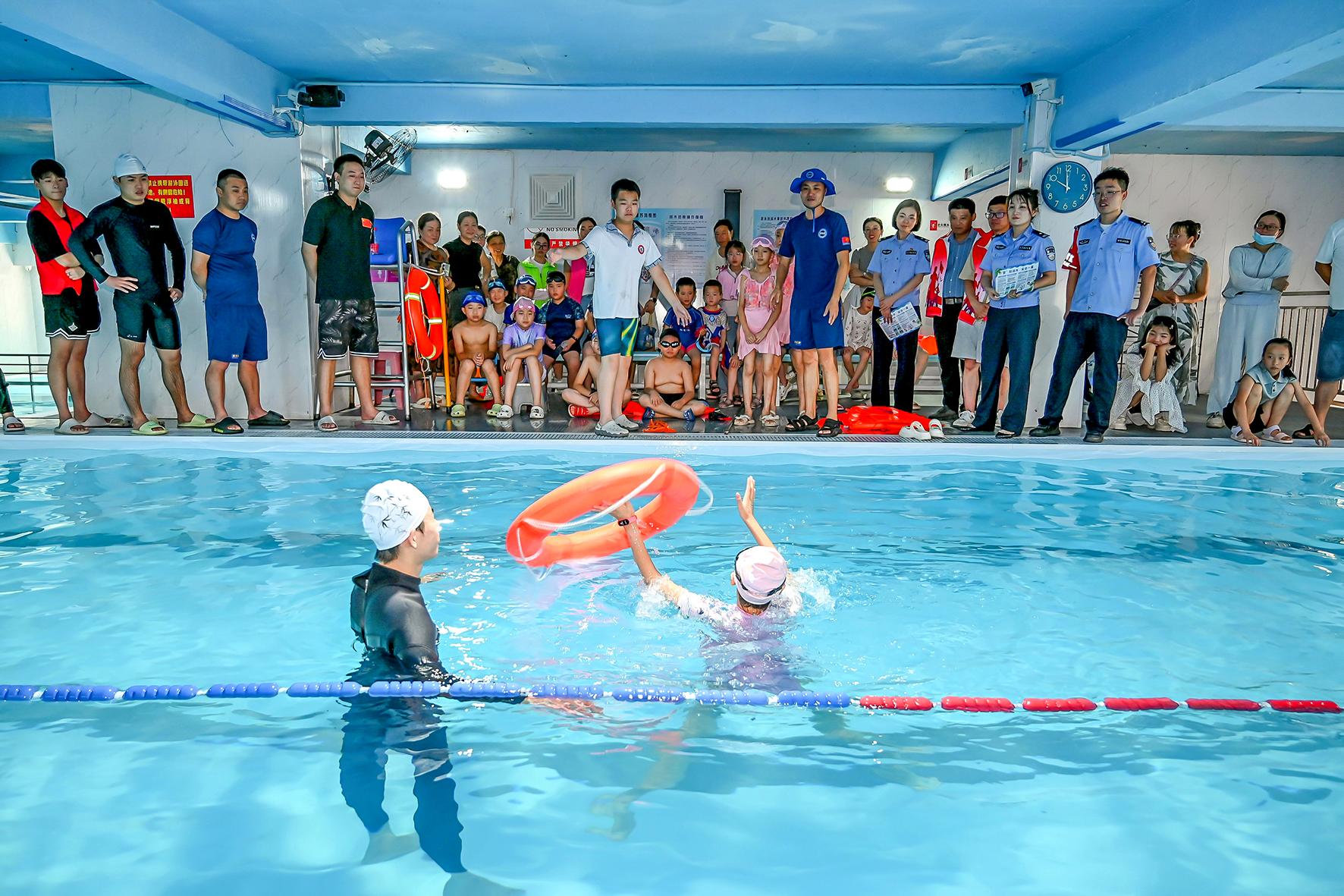 7月29日,安徽省馬鞍山市和縣公安局聯(lián)手藍(lán)天救援隊(duì)在歷陽鎮(zhèn)大橋社區(qū)一游泳館對(duì)未成年人開展防溺水救援知識(shí)培訓(xùn)。
