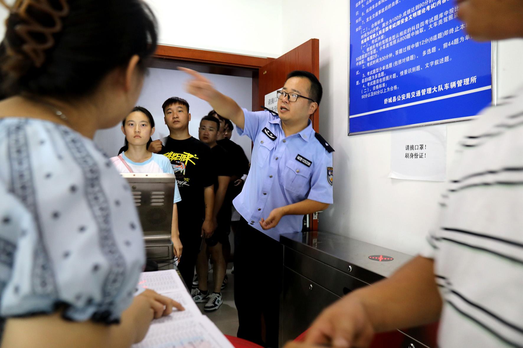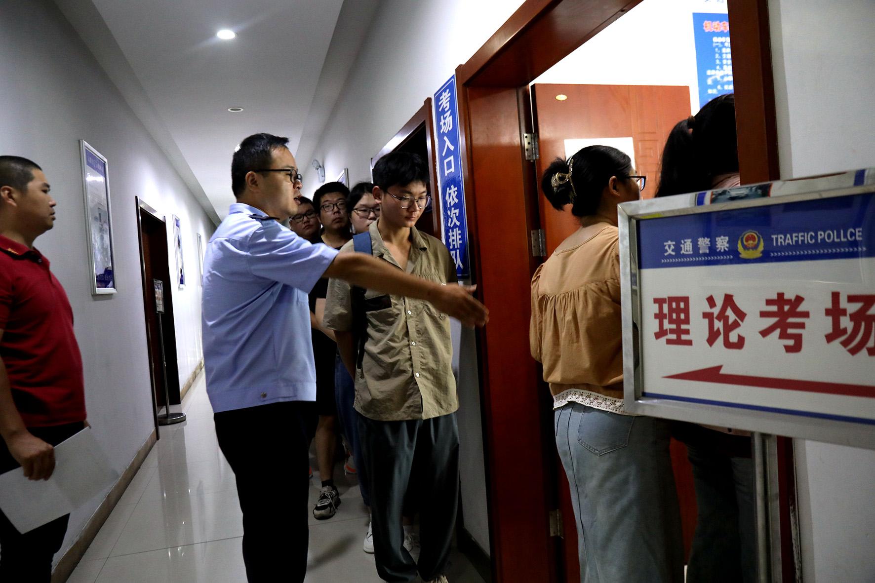 8月1日,安徽省舒城縣公安局交管大隊(duì)車管所民警輔警在科目一考場(chǎng)為參加考試的考生提供服務(wù)。暑假期間,報(bào)名駕考人員大部分為大學(xué)生及高中畢業(yè)生,車管所通過增加工作時(shí)間、考試場(chǎng)次、增派考試員等方式,全力應(yīng)對(duì)暑期“駕考熱”。