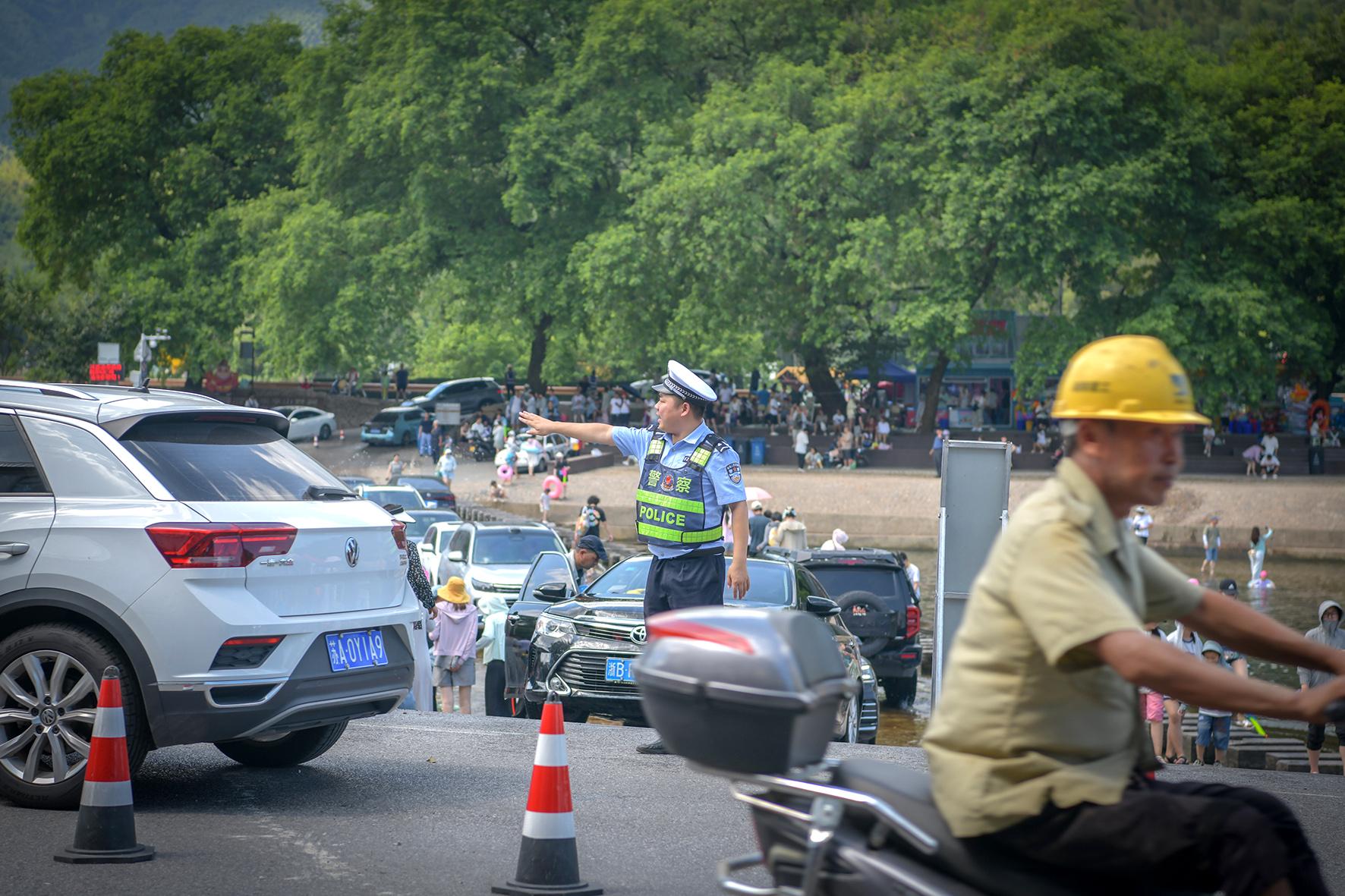 8月3日,氣溫40度。安徽省涇縣公安局民警在涇縣蔡村鎮(zhèn)“月亮灣”景區(qū)疏導(dǎo)交通。