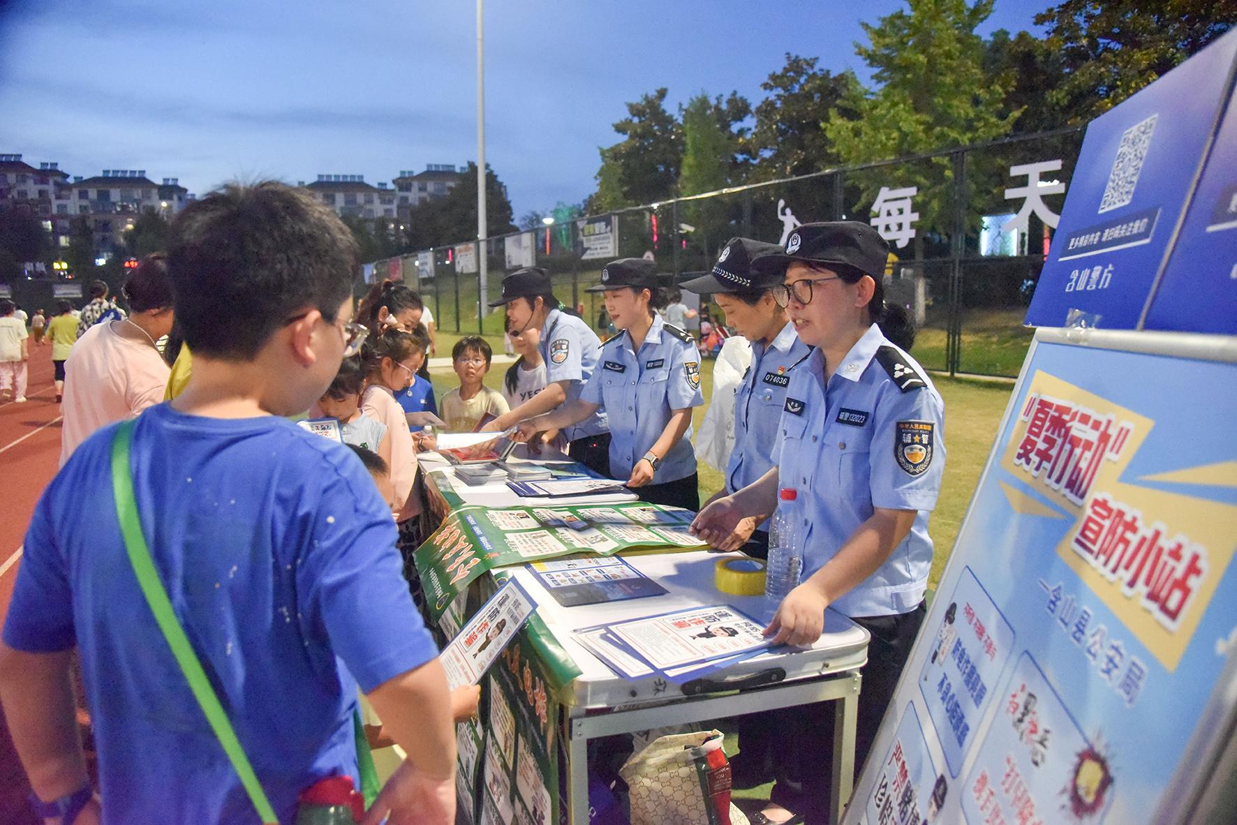 8月11日晚,安徽省當(dāng)涂縣公安局平安小分隊(duì)結(jié)合夏夜治安巡查宣防統(tǒng)一行動(dòng),深入社區(qū)、公園、夜市、廣場和群眾納涼場所等,以群眾“看得見、容易懂、記得住”的方式,開展防養(yǎng)老詐騙、防溺水、反傳銷、禁毒等安全知識(shí)宣傳。