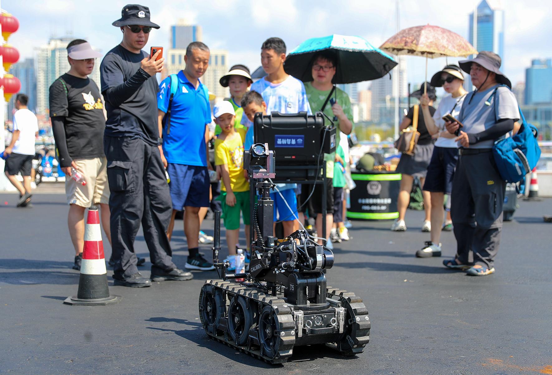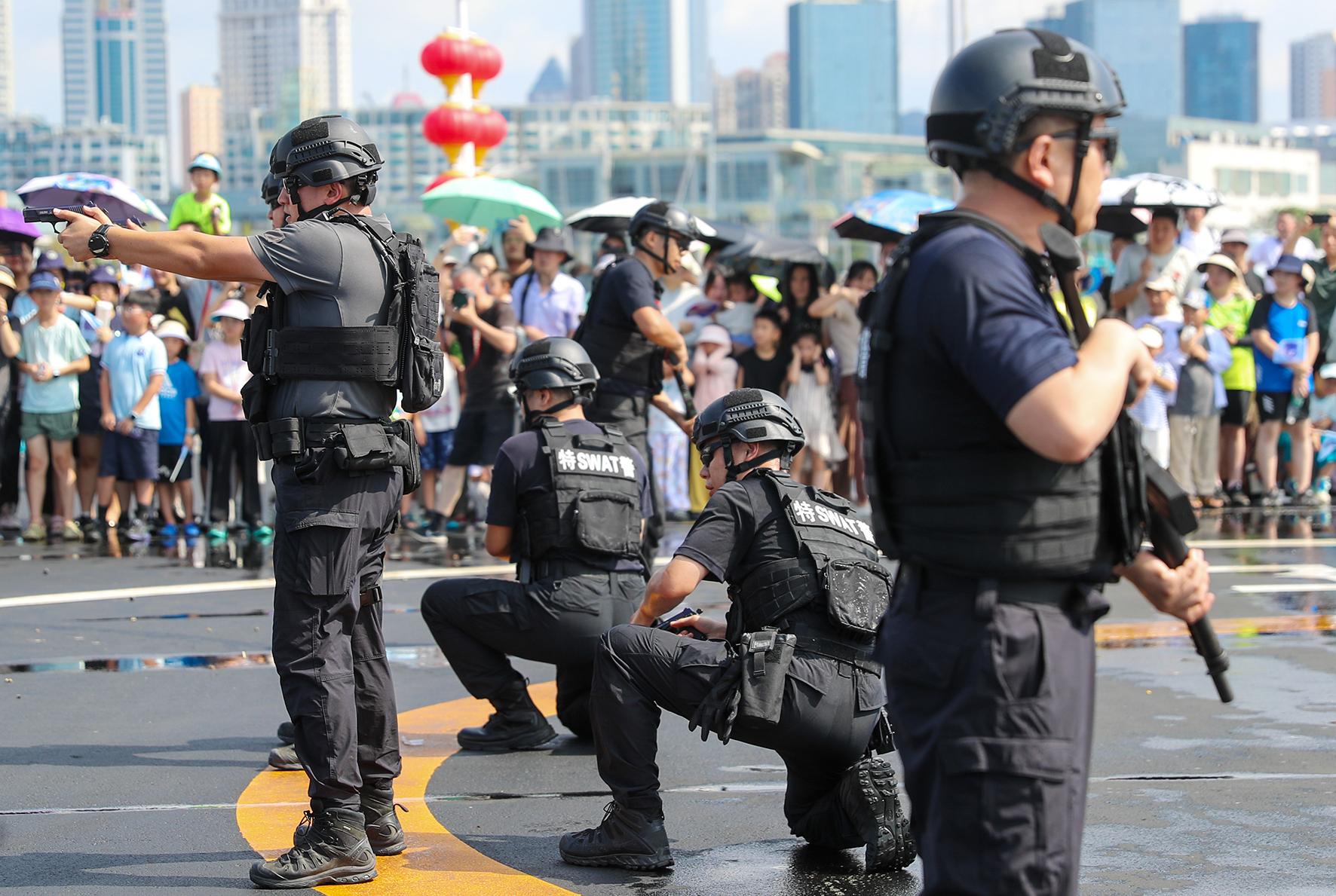 8月18日,山東省青島市公安局特警警營(yíng)開放日活動(dòng)在青島奧林匹克帆船中心舉行,相關(guān)警種設(shè)置展臺(tái)與市民互動(dòng),并進(jìn)行警務(wù)技能演示和警務(wù)裝備展示。